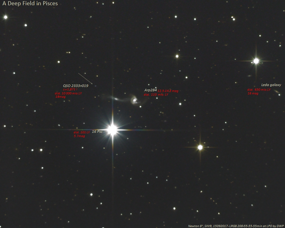 Auf der Aufnahme sind die darauf befindlichen Objekte bezeichnet: 16 Pisces (Entfernung 101 Lichtjahre), Arp 284 (110 Millionen Lichtjahre), Leda-Galaxie (650 Millionen Lichtjahre), der Quasar 2333-019, 10 Milliarden Lichtjahre, z = 1,871!