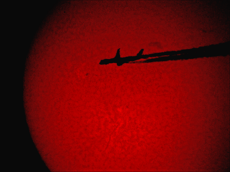 Hier sieht man keinen Billigairlineflieger kurz vor dem Zerbruch durch Deformation, sondern die Seeingprobleme selbst bei dieser kurzen Belichtungszeit! Ein Einzelbild mit 1,7 Millisekunden (!) mit dem kleinen PST bei sehr schlechten Bedingungen. Aber: Ein erster Flieger 2016 vor der Sonne ist ein Foto wert :-)