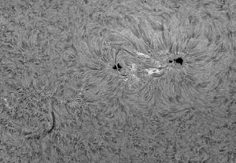 Zu dieser Serie gehört natürlich auch eine H-Alpha-Aufnahme des Sonnenfleckes 2644 – in Schwarz-Weiß des besseren Kontrastes wegen.