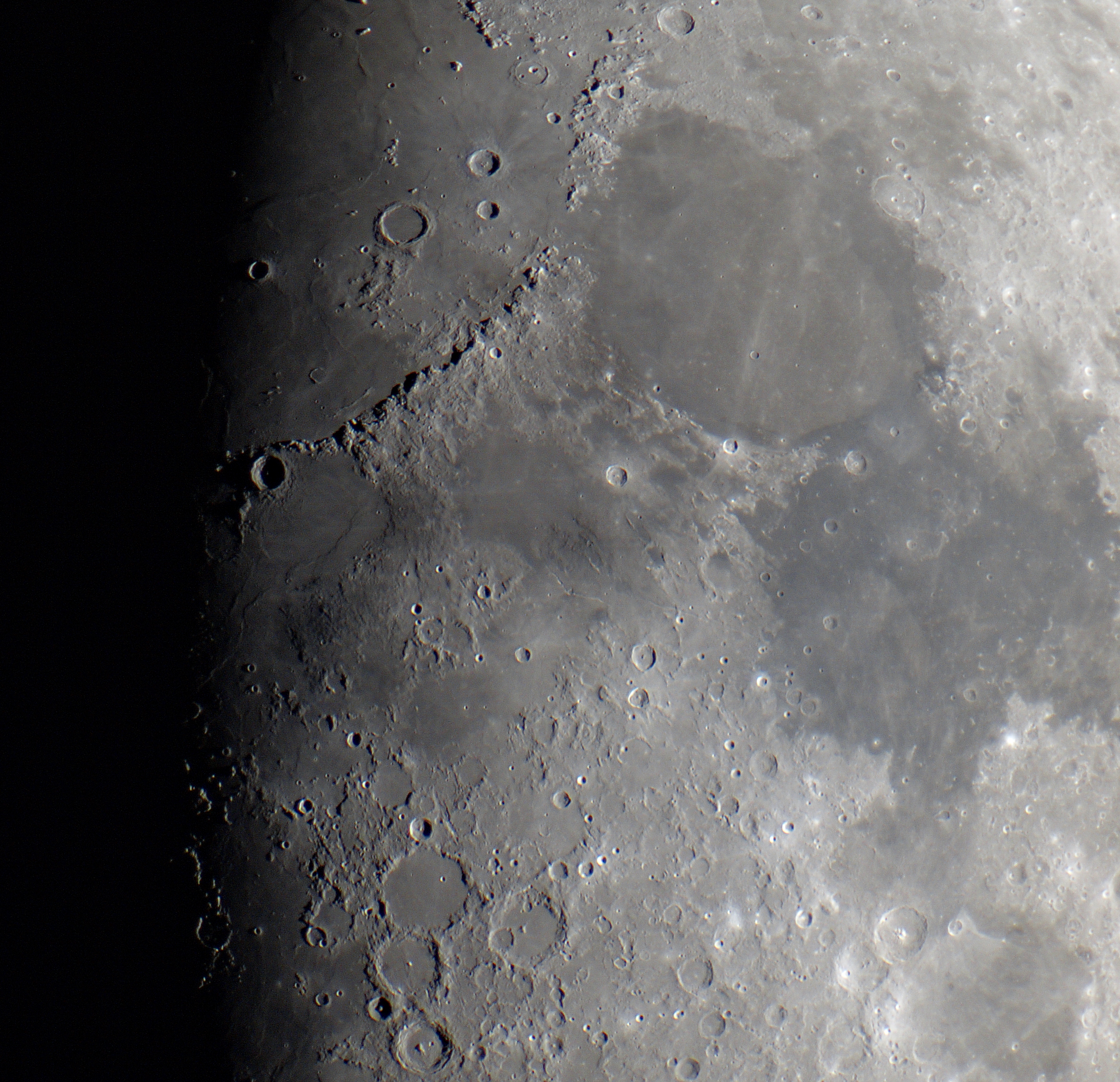 Mir gefällt immer wieder der sehr schöne farbliche Unterschied der Mare Serenitatis und Mare Tranquillitatis (bläulich) und die rötlichen Färbungen rechts und links der Apenninen.