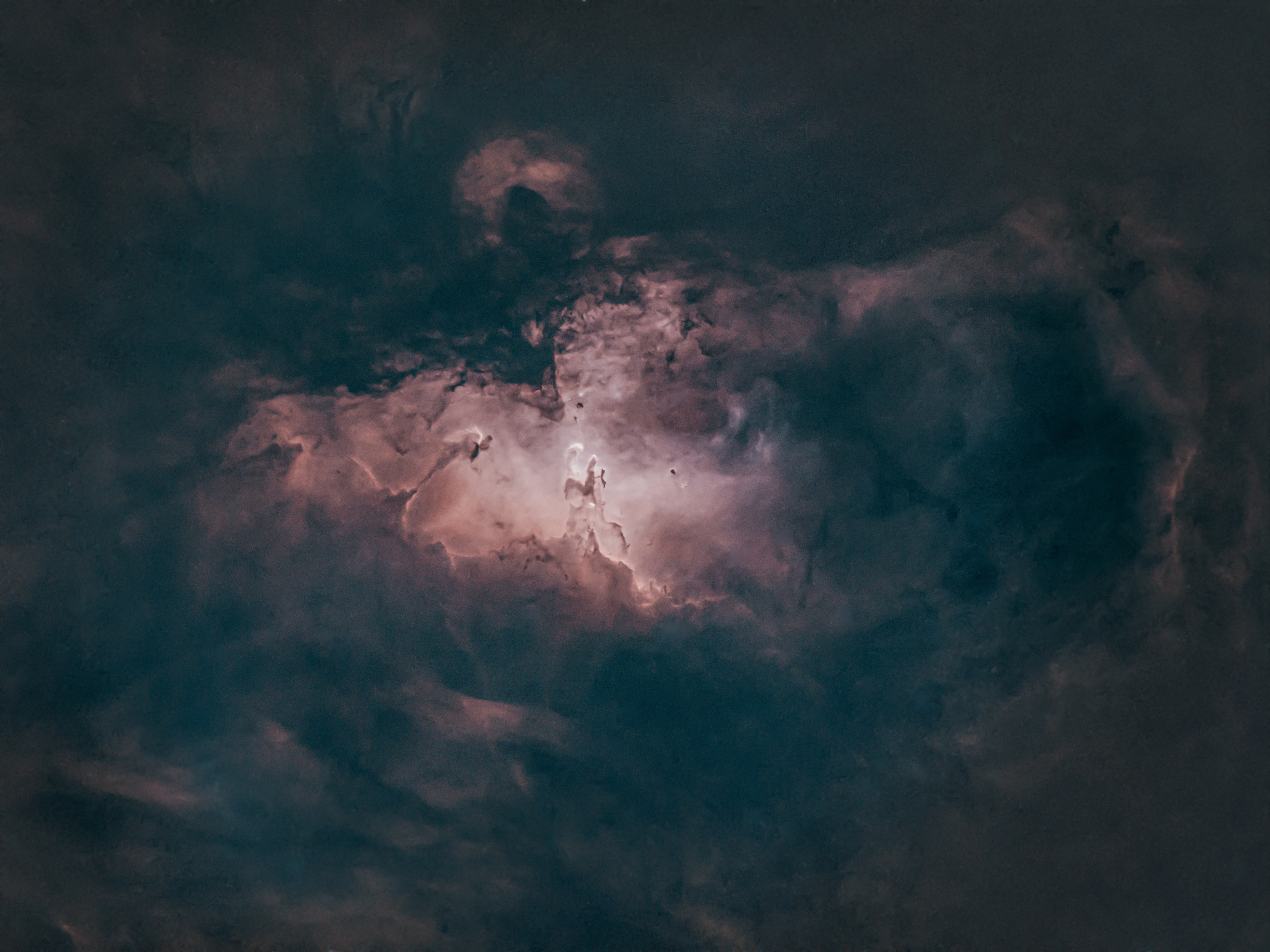 Der Adlernebel mit den Säulen der Schöpfung im Sternbild Schlange. Das Foto entstand mit einem Duo-Schmalband-Filter vom lichverschmutzen Balkon am Stuttgarter Stadtrand. Insgesamt wurde nur 69 Minuten belichtet. Die Sterne wurden bei der Software-Bearbeitung entfernt, um einen ungetrübten Blick auf das Nebelgebiet zu erlangen.