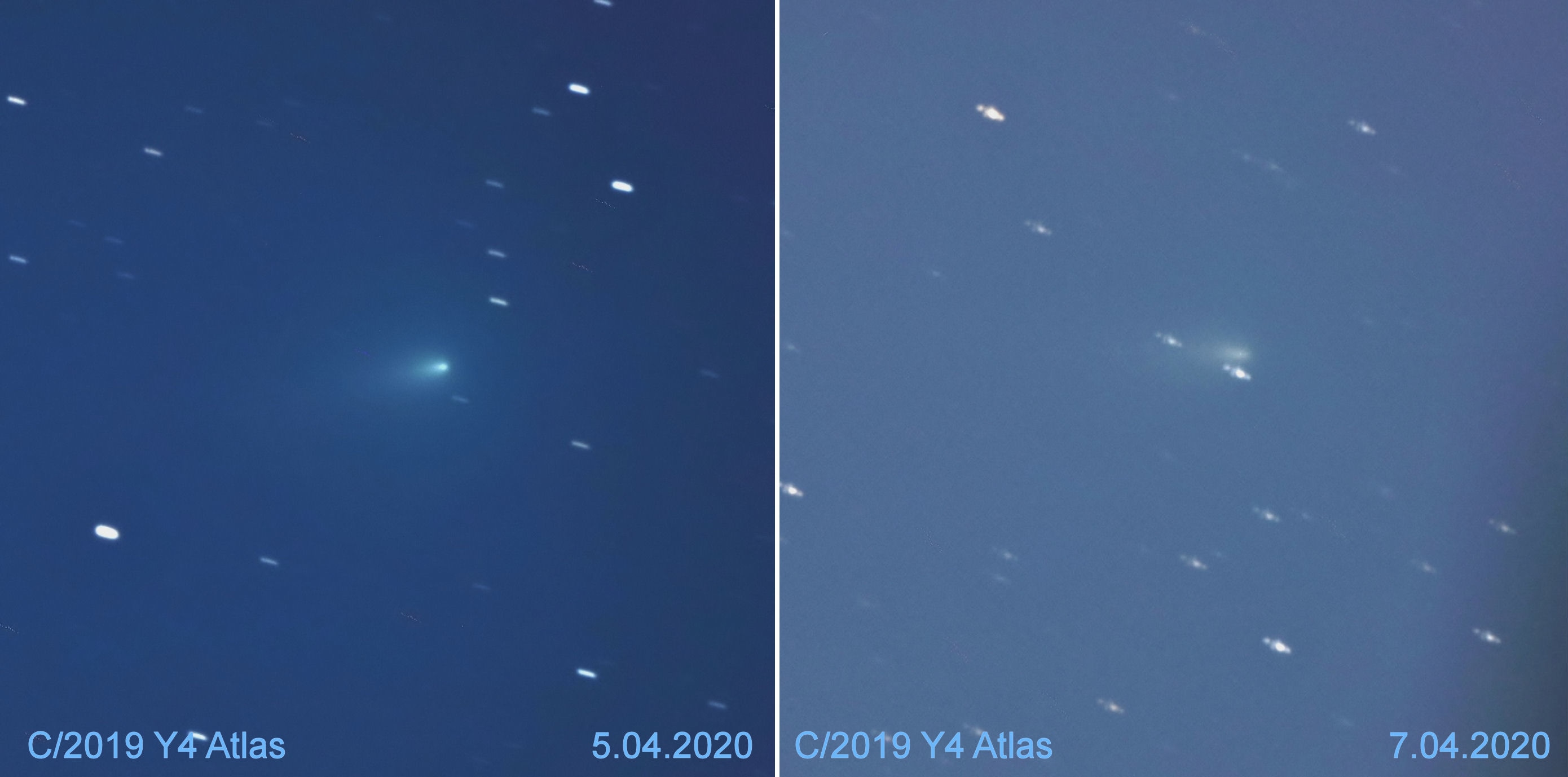 Am 6. April 2020 las ich Meldungen, dass Komet Y4 Atlas eventuell auseinanderbricht. Daher machte ich bei Vollmond am 7. April 2020 eine Aufnahme des Kometen, die einen deutlichen Helligkeitsabfall und Veränderungen in der Koma gegenüber der Aufnahme vom 5. April 2020 zeigt. Wäre sehr schade, wenn das bereits das Ende ist.