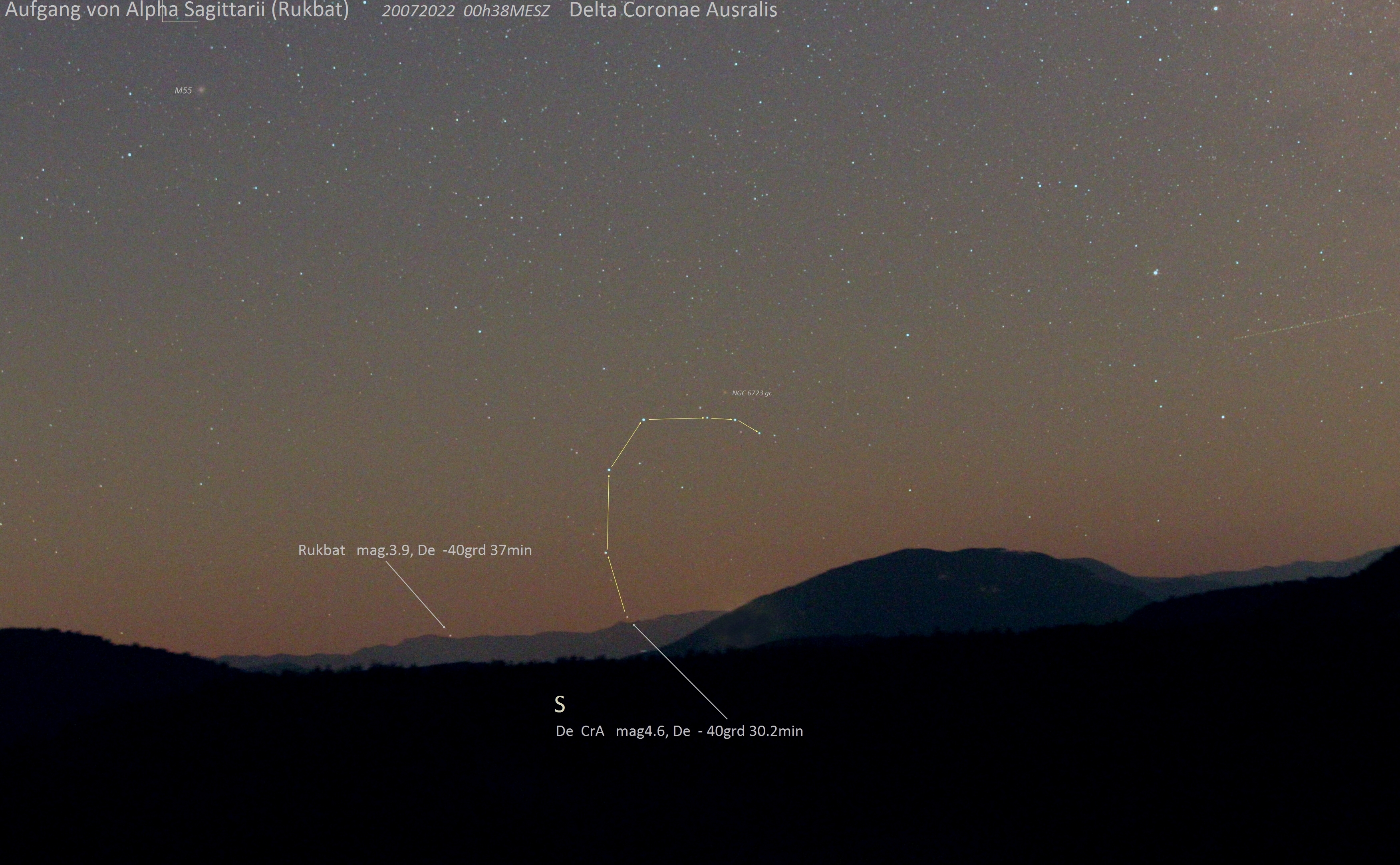 Auf meiner Jagd nach dem (helleren) Stern mit der tiefsten Deklination, der von meiner Gegend aus noch über dem Südhorizont zu entdecken ist, gelang es mir endlich, nachdem ich voriges Jahr schon Delta Coronae Australis aufnehmen konnte, den Hauptstern des Schützen, Rukbat, den wenige von uns kennen werden,weil er unauffällig ist (nur 3,9 mag) und ganz im Süden des Sternbilds neben der Südlichen Krone steht, aufs Bild zu bannen, obwohl der aufgehende Mond schon den Himmel im Süden erhellte. Die geographische Breite meines Beobachtungsortes betrug 48 Grad 02 min Nord. Hier erscheint er hinter einen fernen Bergkuppe. Delta Coronae Australis hat gerade kulminiert.