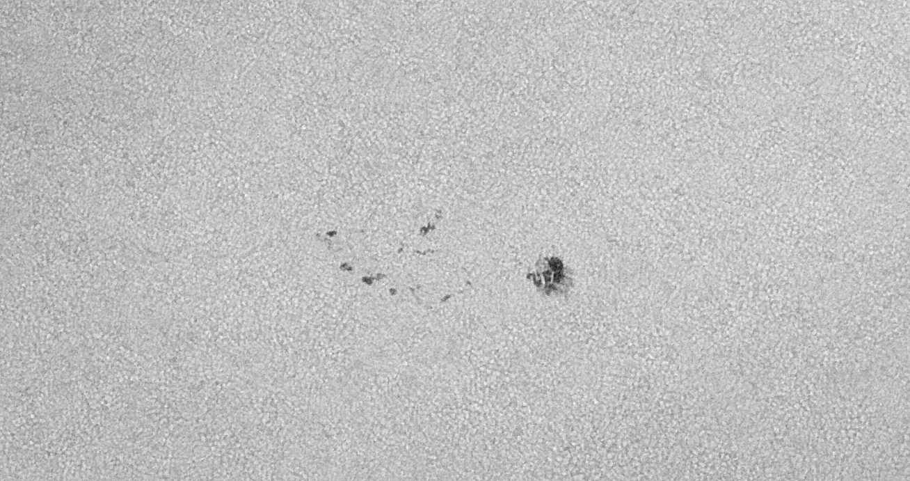 Vor kurzem war diese Fleckengruppe noch gar nicht zu sehen. Zwei Lichtbrücken sind gut zu erkennen. Die Fleckengruppe ist auch sehr klein, die Nachvergrößerung aus dem Vollbild daher sehr stark. Da es ein Einzelbild ist, kann man sehr schön die Luftbewegung sehen, an einigen Stellen kommt die Granulation etwas zum Vorschein, an anderen Stellen scheint die Oberfläche verwaschen.