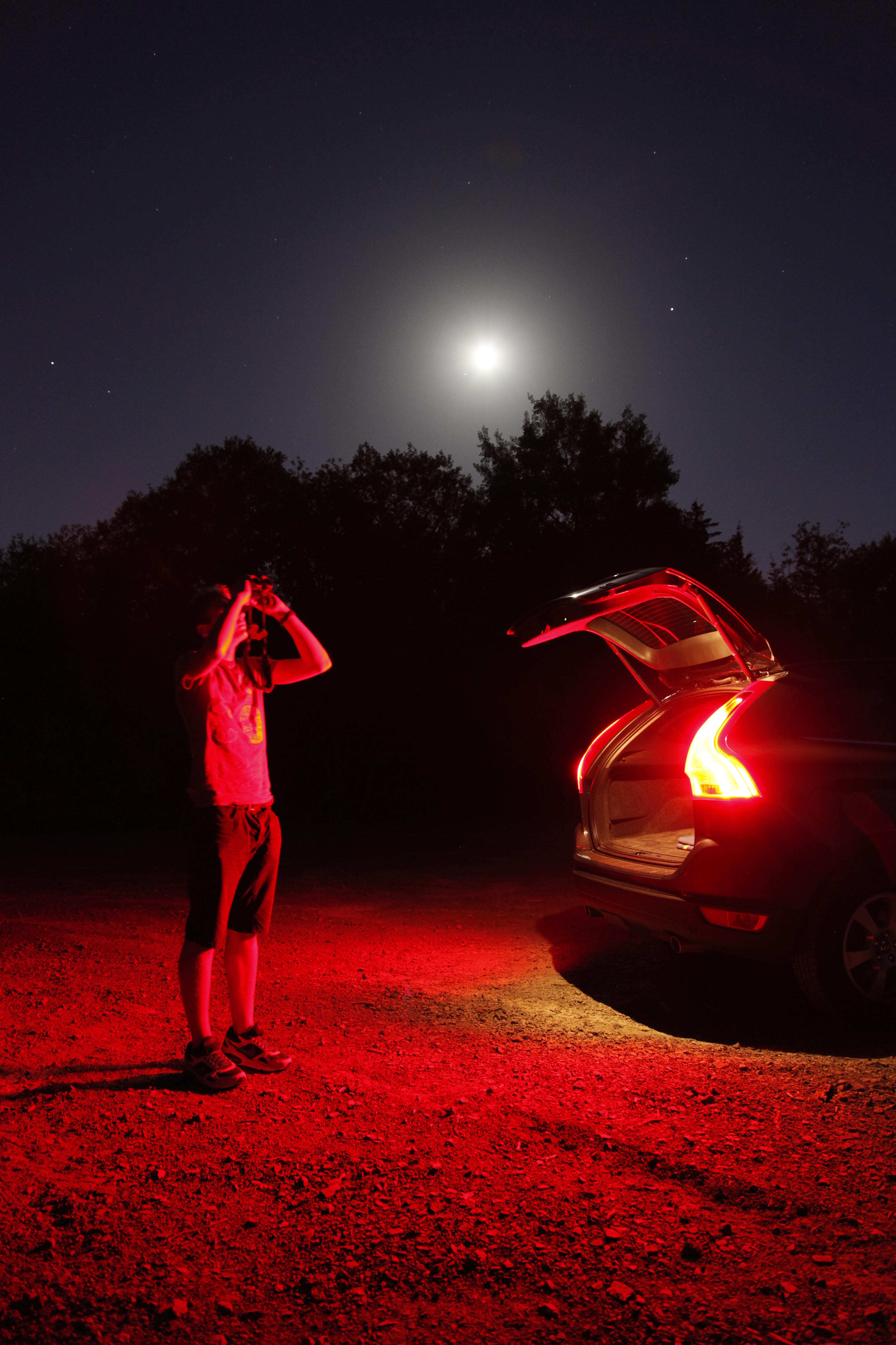 Während der heißesten Pfingsttage seit Beginn der Wetteraufzeichnungen war es auch kurz vor Mitternacht noch so warm, dass man in kurzen Hosen und T-Shirt beobachten konnte. Auf dem Foto des Fernglasbeobachters steht der Mond direkt neben Spika in der Jungfrau, links am Bildrand Saturn, rechts neben dem Mond der Mars.
