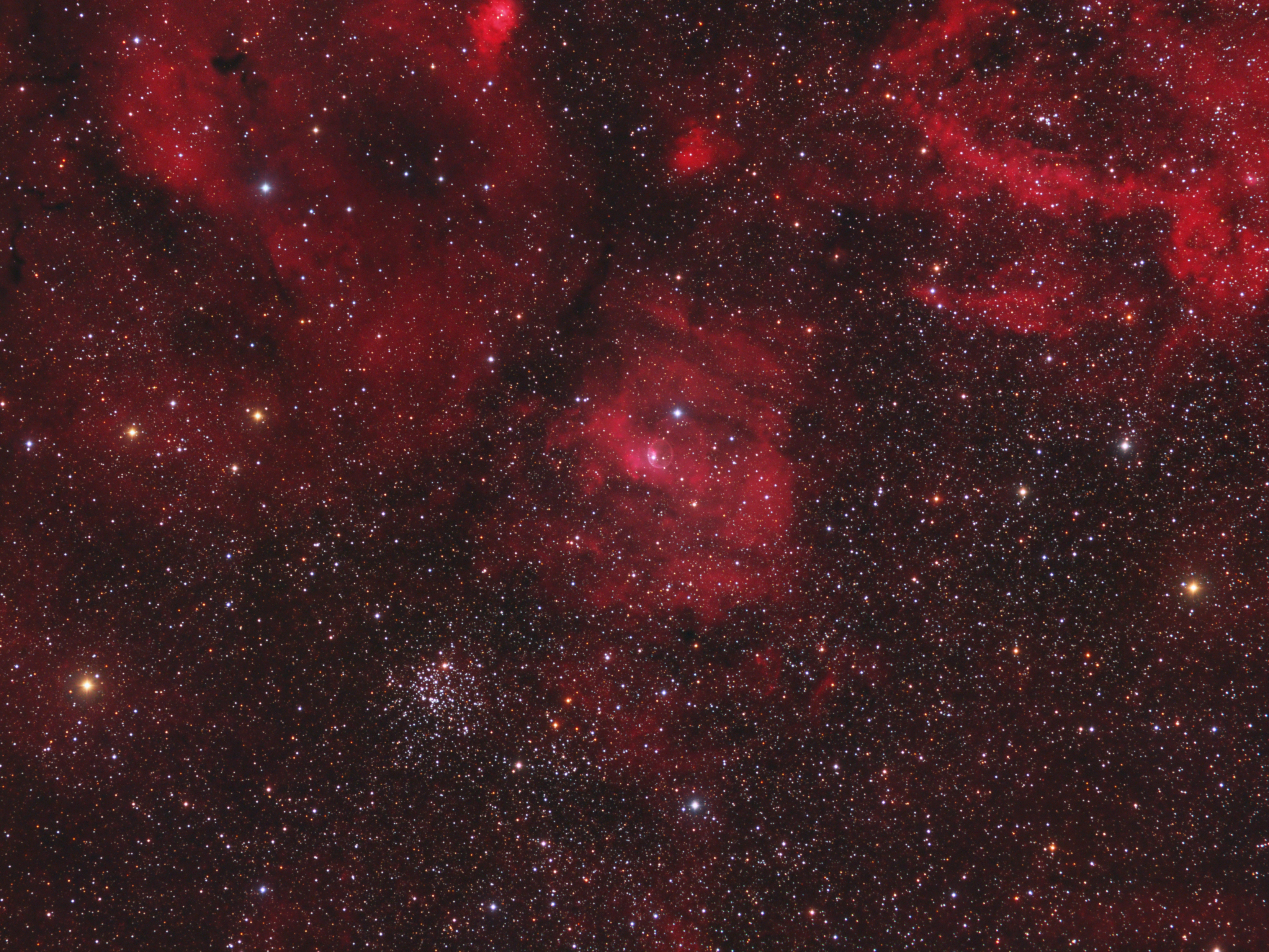 Eine fotografisch sehr ansprechende Gegend - Der Bubble-Nebel und Messier 52 im weiten Feld eingebettet in Wasserstoffnebel.
