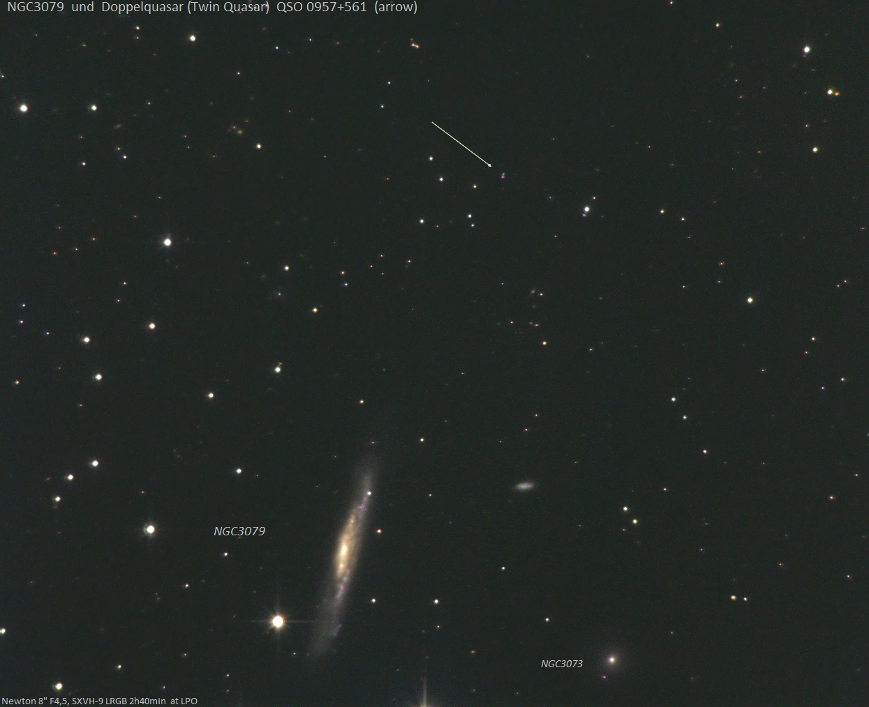 Acht Grad westlich von Beta Ursae majoris (Mirak) finden wir die etwas verzogene Balkenspirale NGC 3079 (10,8 mag, Typ SBc, 8,1 x 1,3 Bogenminuten) in einer Entfernung von 45 Millionen Lichtjahren, daneben die etwa 60 Millionen Lichtjahre entfernte NGC 3073 (13,0 mag). Zentriert man NGC 3079 auf kleinem Chip, so entgeht ein zwar unscheinbares, aber dennoch wahres Highlight der Kosmologie! QSO 0957+561 ist ein durch eine Gravitationslinse doppelt abgebildeter Quasar etwa zehn Bogenminuten nördlich von NGC 3079. Es war das erste entdeckte Gravitationslinsensystem mit mehreren Bildern überhaupt und ist eines der am besten untersuchten Objekt dieser Art. Auf Grund der Krümmung der Raumzeit durch die Masse der Gravitationslinse entstehen zwei Bilder des Quasars, die sechs Bogensekunden voneinander entfernt sind.Die Bilder haben eine scheinbare Helligkeit von 16,5 mag (Komp. B) und 16,7 mag (Komp. A). Der Quasar weist eine Rotverschiebung von z = 1,41 (Entfernung 9 Milliarden Lichtjahre) auf. Hauptkomponenten der Gravitationslinse sind ein Galaxienhaufen bei z = 0,36 (4 Milliarden Lichtjahre) und seine cD-Galaxie G1 sowie eine Galaxiengruppe bei z = 0.5. Die cD Galaxie G1 liegt nur eine Bogensekunde von Komp. B des Quasar entfernt.Sie hat nur 21,9 mag Helligkeit. Dadurch erscheint die eine Komponente heller als die andere. Die Lichtlaufzeit beider Komponenten zur Erde unterscheidet sich um 417 Tage, was bedeutet, dass das Licht der südlichen Komponente B einen Mehrweg von 1,1 Lichtjahren zu uns zurücklegen muß! Der Doppelquasar wurde 1979 von britischen Team D.Walsh und R.Carswell und dem Amerikaner Ray Weyman mit dem 84" Teleskop des Kitt Peak National Observatory in Arizona entdeckt. Mich hat überrascht, dass ich mit meinem 8-Zoll-Newton F_ 900mm, die sechs Bogensekunden Abstand so deutlich auflösen konnte.