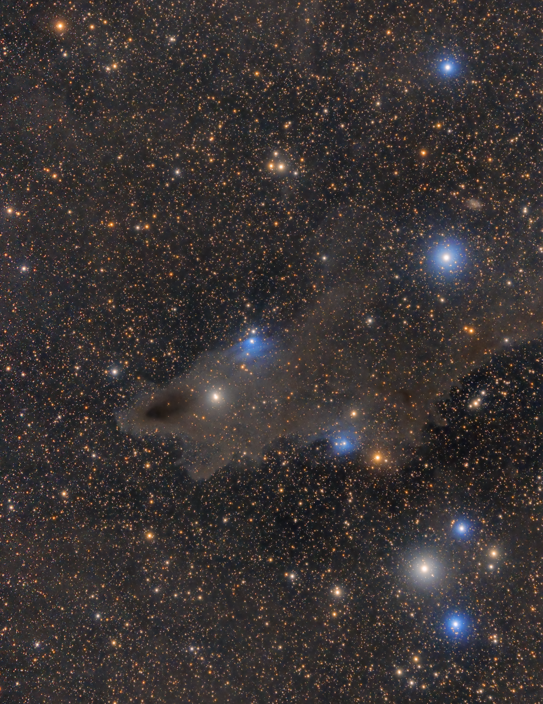Ich nutzte eine der seltenen klaren Novembernächte, um ein nicht mehr ganz so leichtes Objekt bei klirrender Kälte zu fotografieren. Die Helligkeit des so genannten Dark-Shark-Nebels ist so gering, dass das Objekt während der Aufnahmen auf dem Kameradisplay praktisch nicht sichtbar war. Erst das Summenbild aller Einzelaufnahmen zeigte einen leichten Schein der Staubwolke samt den kleinen blauen Reflexionsnebeln VdB 149 & 150.