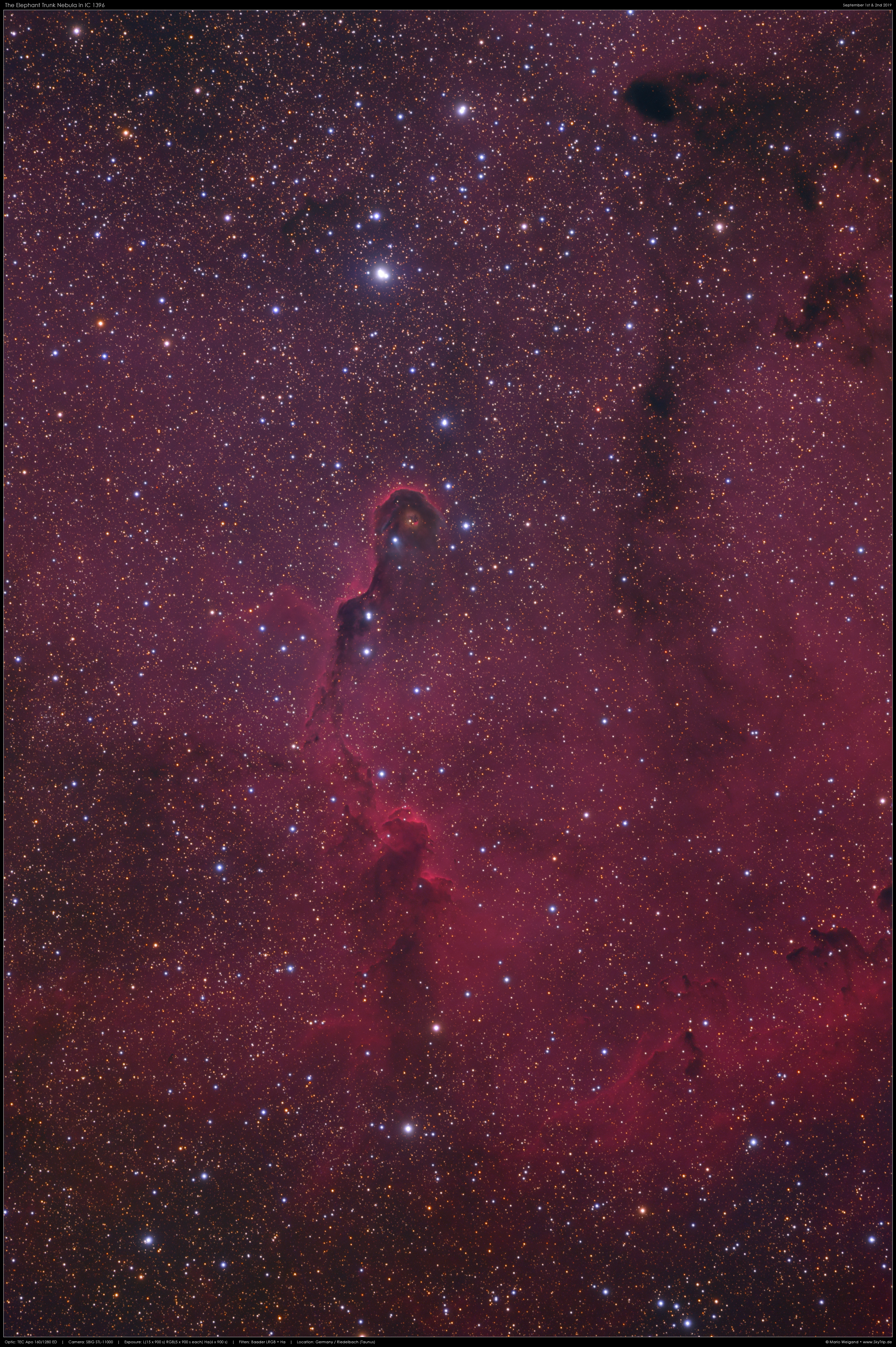 Dieses Bild zeigt den östlichen Teil des Nebels IC 1396, wo die spannendsten Strukturen zu finden sind. Das markanteste Merkmal ist nämlich der "Elefantenrüsselnebel", auch unter der Katalogbezeichnung IC 1396A bekannt. Oft wird er auch mit vdB 142 bezeichnet. Jene Bezeichnung meint aber eigentlich einen kleinen Reflexionsnebel um den Stern HD 239710, der jedoch möglicherweise in physikalischem Bezug zu IC 1396A steht. Es handelt sich bei IC 1396A um eine große Globule und eine aktive Sternentstehungsregion.