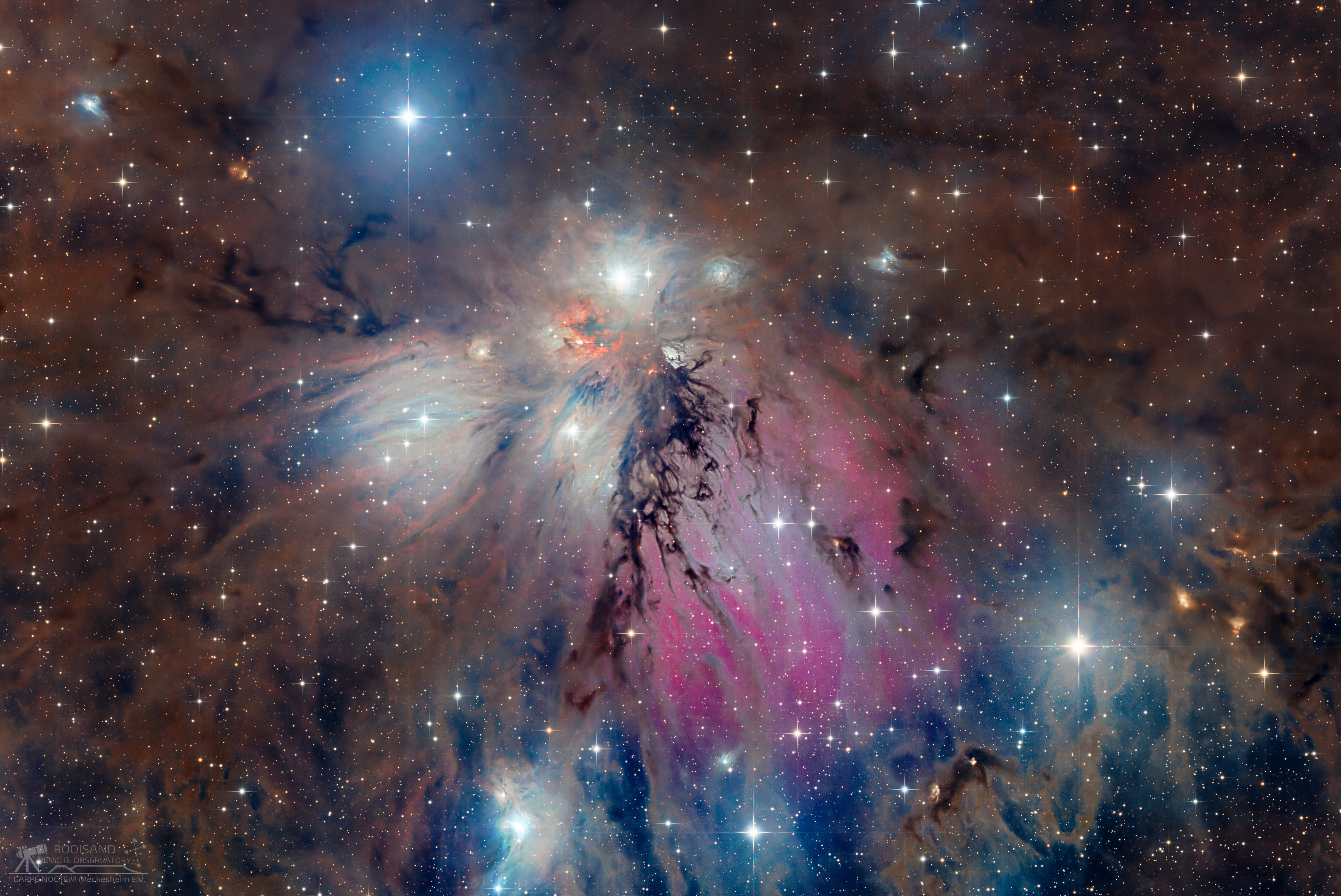 Der Engelnebel NGC 2170, etwa 6500 Lichtjahre von der Erde entfernt im südlichen Sternbild Einhorn, vereint eine Mischung schönster und verschiedenster Nebeltypen in sich. Bläuliche Farbtöne entstehen durch Staub, der das Licht nahegelegener Sterne reflektiert. Wasserstoffwolken, angeregt durch das UV-Licht besonders heißer Sterne, leuchten rötlich. Dunkle Wolken, die nur als Silhouette zu sehen sind, blockieren dahinter liegenden Licht, sogenannte Absorbtionsnebel.