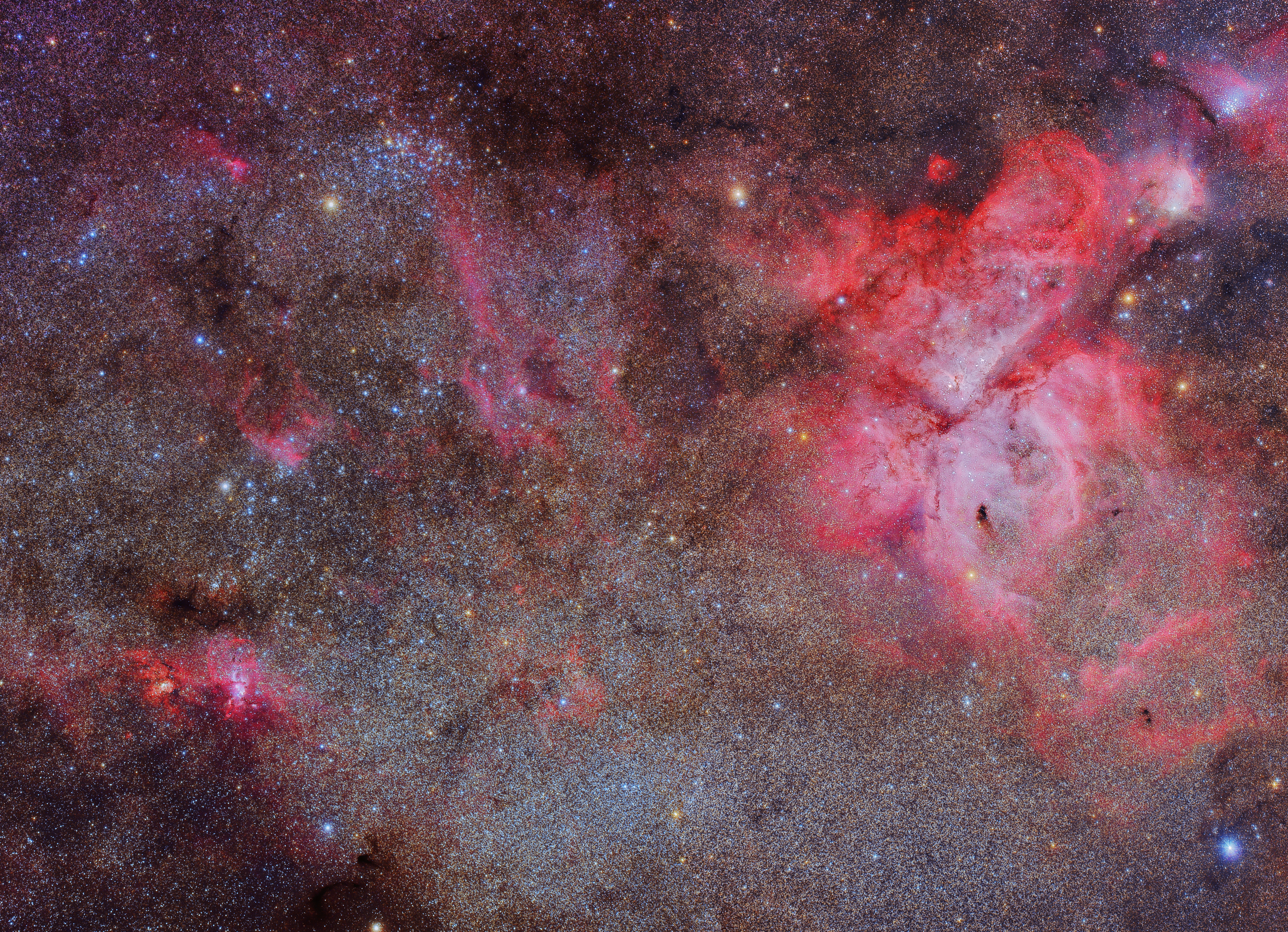 Neben dem Eta-Carinae-Nebel finden wir im Sternengewimmel des gleichnamigen Sternbildes weitere beeindruckende und schöne astronomische Objekte. Links oben auf der Aufnahme sehen wir den offenen Sternhaufen NGC 3352, wegen seiner großen Anzahl an Sternen auch als Nadelkissen bezeichnet. Weiter unten im Bild befinden sich zwei sehr schöne Emissionsnebel. Der linke davon, NGC 3603 enthält einen sehr jungen Sternhaufen, der nur deshalb so klein erscheint, weil der Emissionsnebel etwa 20000 Lichtjahre entfernt ist. Der rechte, etwas bläulich-rötere Nebel, besitzt eine ganze Anzahl von NGC-Bezeichnungen und wird auch als kleiner Tarantelnebel oder als Freiheitsstatue bezeichnet. Süden ist links im Bild.