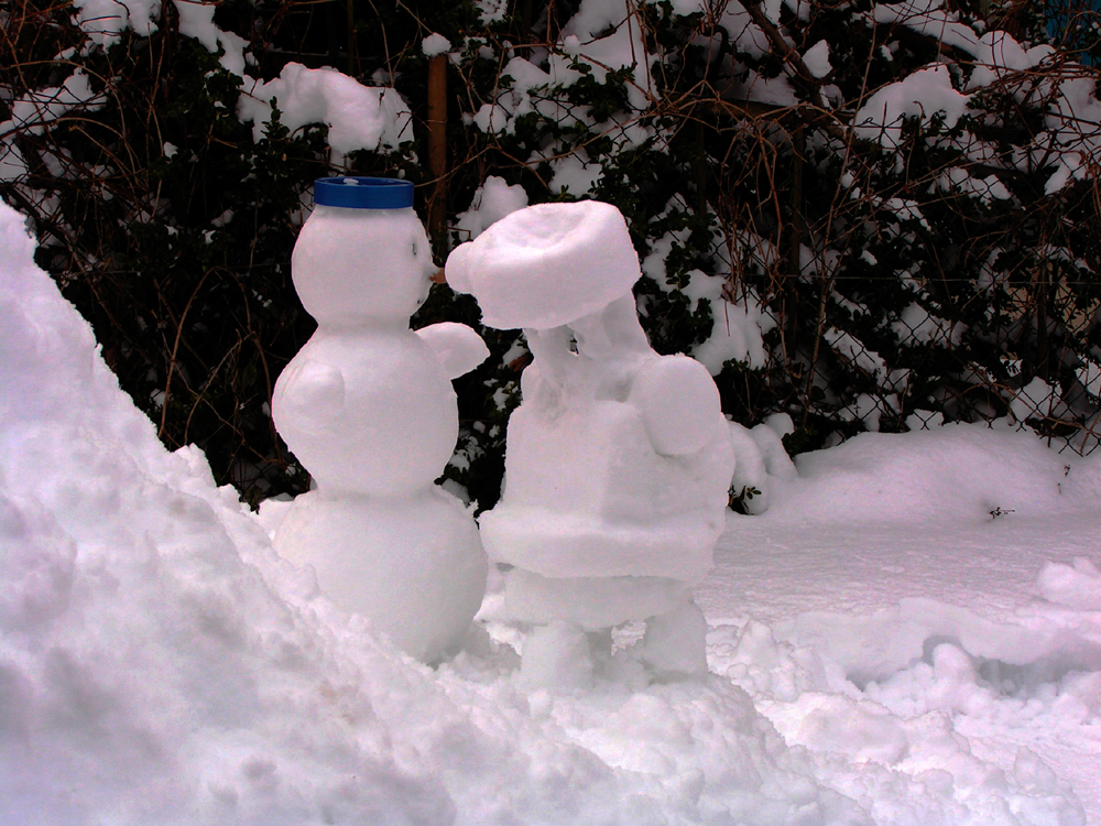 Ein sonderbarer Winterastronom hat sich bei uns im Garten eingefunden. Sein Beobachtungsgerät ein Schneedobson.