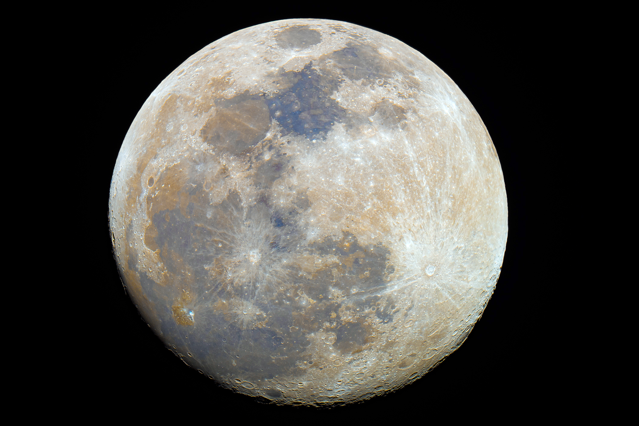 Die Farbinformationen des Mondes sind schon seit mehr als 100 Jahren bekannt und wurden R. W. Wood entdeckt. Die bläuliche Farbe in den Maria stammt von dem Element Titan. Aus einer Serie von Aufnahmen wurden drei Bilder in Registax addiert, und anschließend wurde in Photoshop die Farbsättigung erhöht.