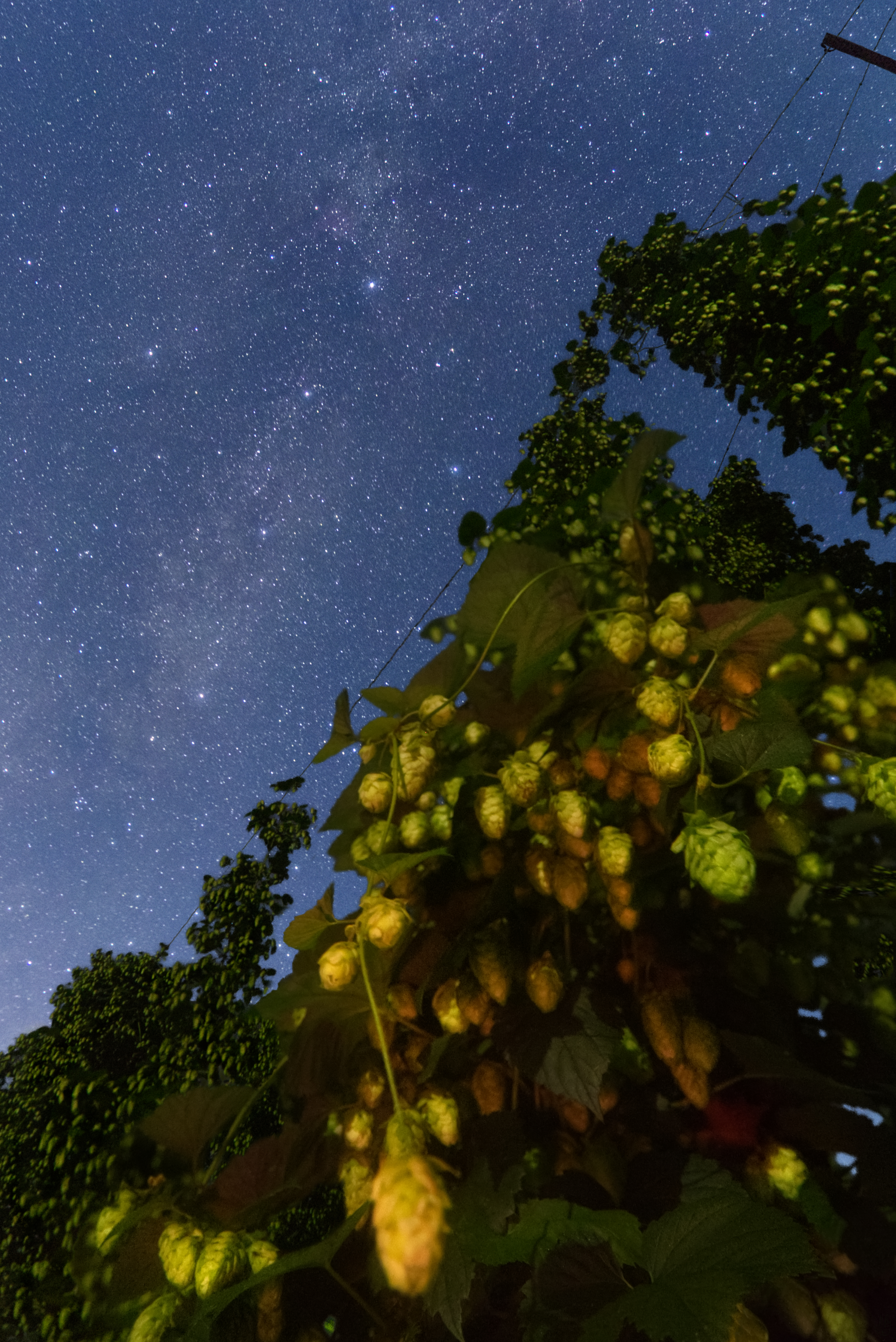 Nahe der Gemeinde Holsthum im romantischen Tal des Flüsschens Prüm im Naturpark Südeifel findet man das einzige Hopfenanbaugebiet von Rheinland-Pfalz. Hier baut Hopfenbauer Andreas Dick den sogenannten Siegelhopfen für eine etwas größere, ebenfalls in der Südeifel ansässigen Bierbrauerei an. Unter den günstigen Bedingungen im Tal der Prüm kann der echte Hopfen erstaunliche Leistungen erbringen: So wächst die schnellwachsende Kletterpflanze im Sommer bis zu 30 cm am Tag, ehe sie mit einer Höhe von 7 Meter ab Ende August geerntet wird. Auf diesem Bild scheinen sich die mächtigen Pflanzen in den klaren Sternenhimmel zu räkeln. Über ihnen zieht der Schwan samt der Milchstraße über das Firmament Richtung Süden, während der Hopfen vom aufgehenden Mond in ein sanftes Licht getaucht wird. Die Aufnahme ist ein Focusstacking. Der vordere Bereich wurde zusätzlich mit einer Lampe beleuchtet.