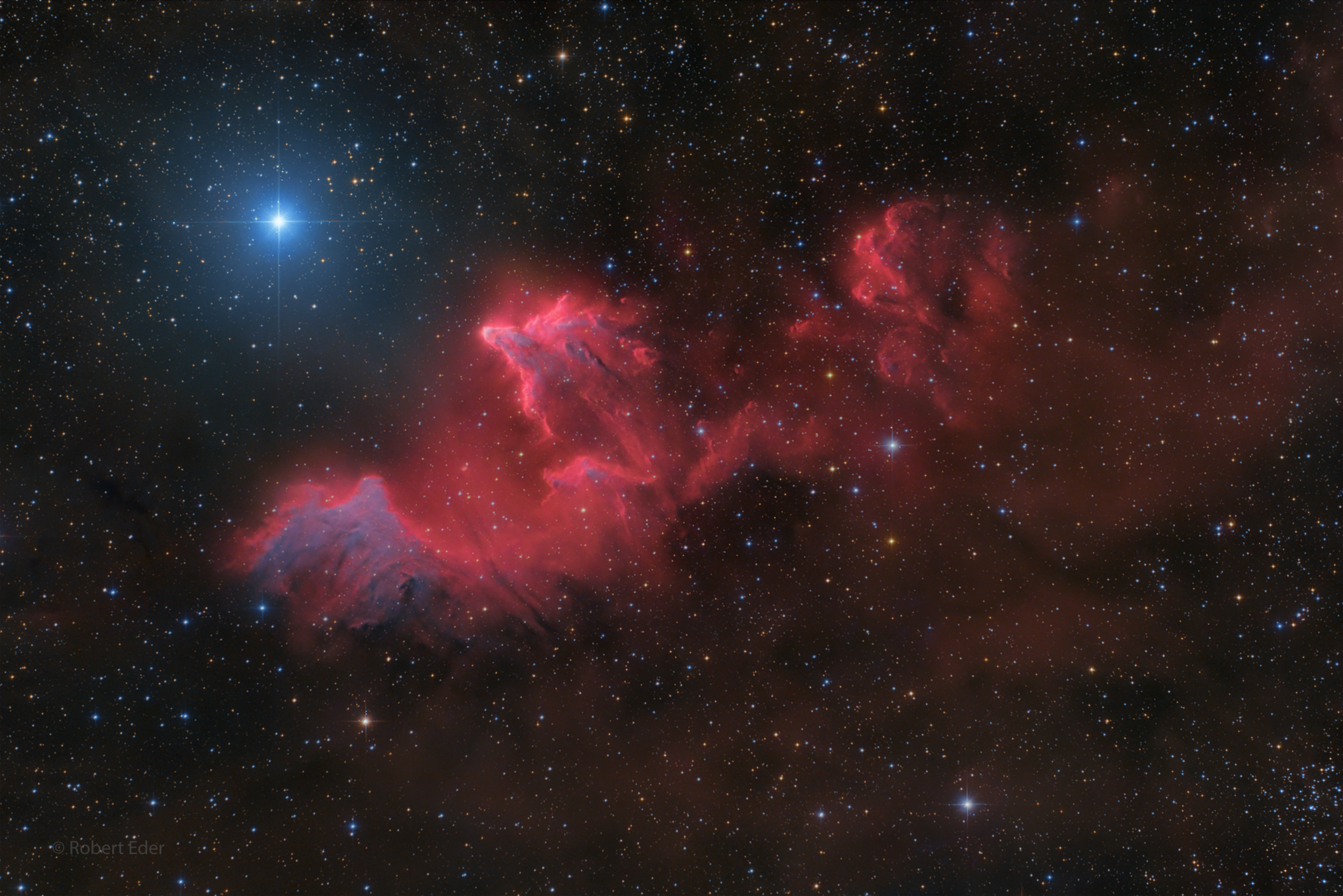 IC 63 (in der Mitte) ist ein Emissionsnebel im Sternbild Kassiopeia. Er liegt etwas näher an dem hellen Stern γ Cas und leuchtet vorwiegend in rotem H-Alpha-Licht. IC 59 (links) ist ein Reflexionsnebel, der etwas weiter vom Stern entfernt ist und anteilsmäßig mehr des charakteristischen blauen Farbtons aufweist. In der rechten unteren Ecke befindet sich auch noch der offene Sternhaufen NGC381.