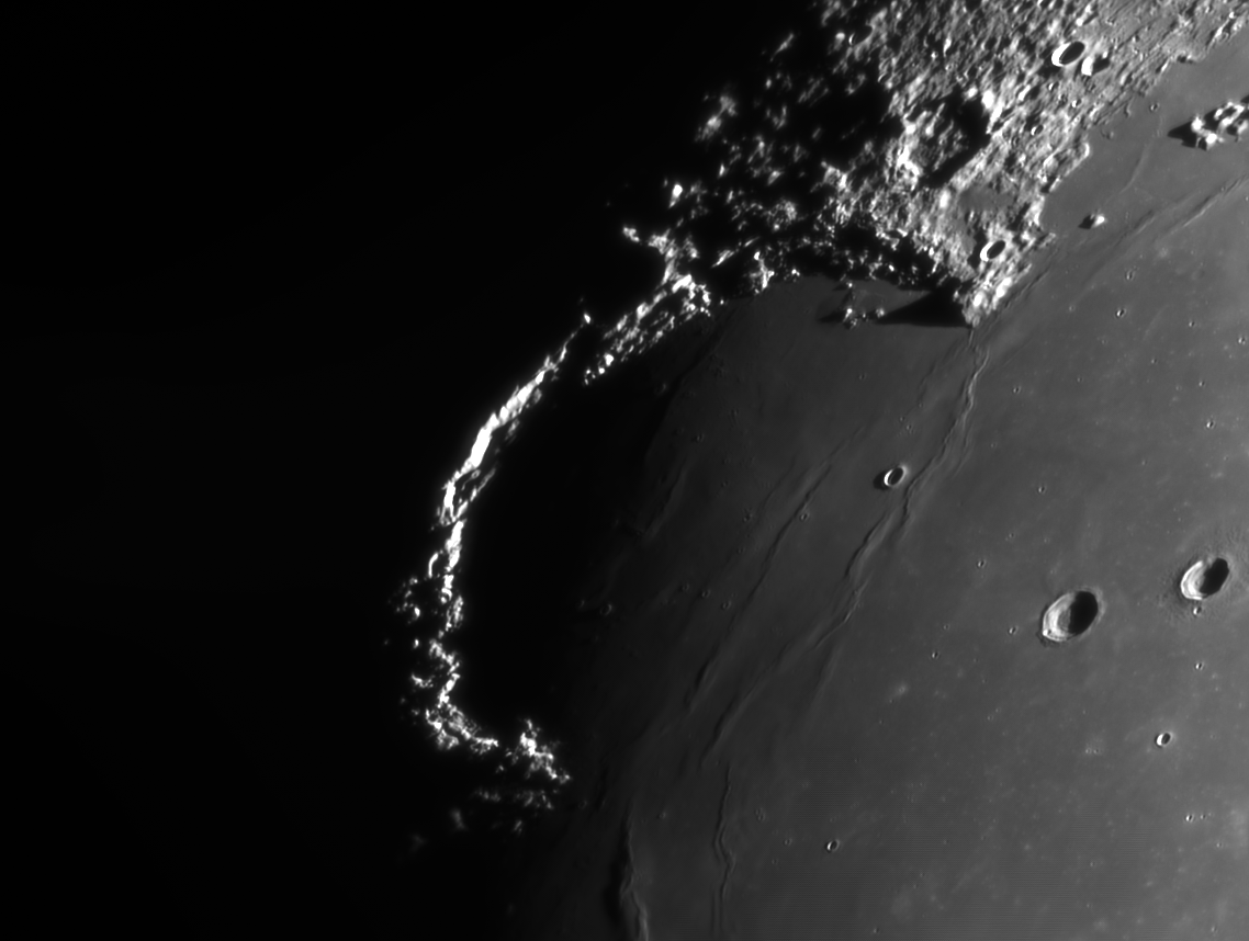 Nach längerer Schlechtwetterperiode war es im Februar endlich wieder klar. Der Mond stand für diese Jahreszeit entsprechend hoch und bot sich zur Fotografie an. So entstand diese Detailaufnahme der Regenbogenbucht (Sinus Iridum). Sehr schön sind bei dem flachen Sonnenstand die Lavarücken zu sehen. Aus ursprünglich 18000 Bildern wurden 5400 zu diesem Bild verarbeitet.