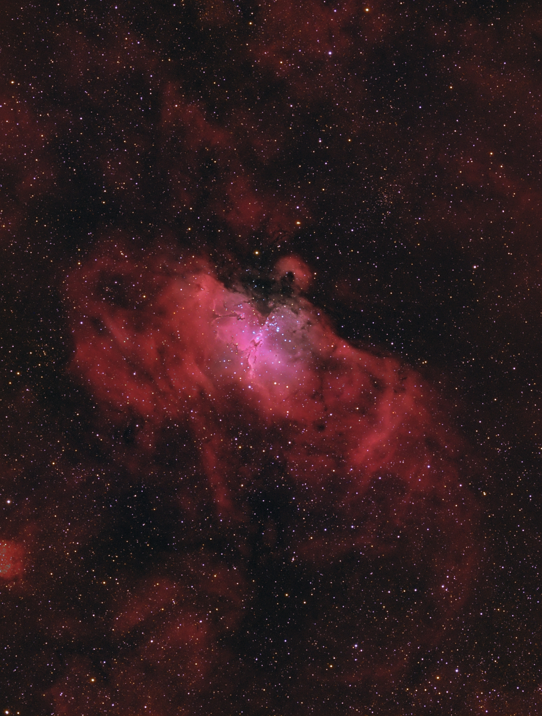 Erst spät in der Nacht geht der Adlernebel, Messier 16, hinter dem Nachbarhaus auf. Daher ein Objekt, das ich nur sehr kurz belichten kann. Trotzdem bin ich mit dem Ergebnis sehr zufrieden.