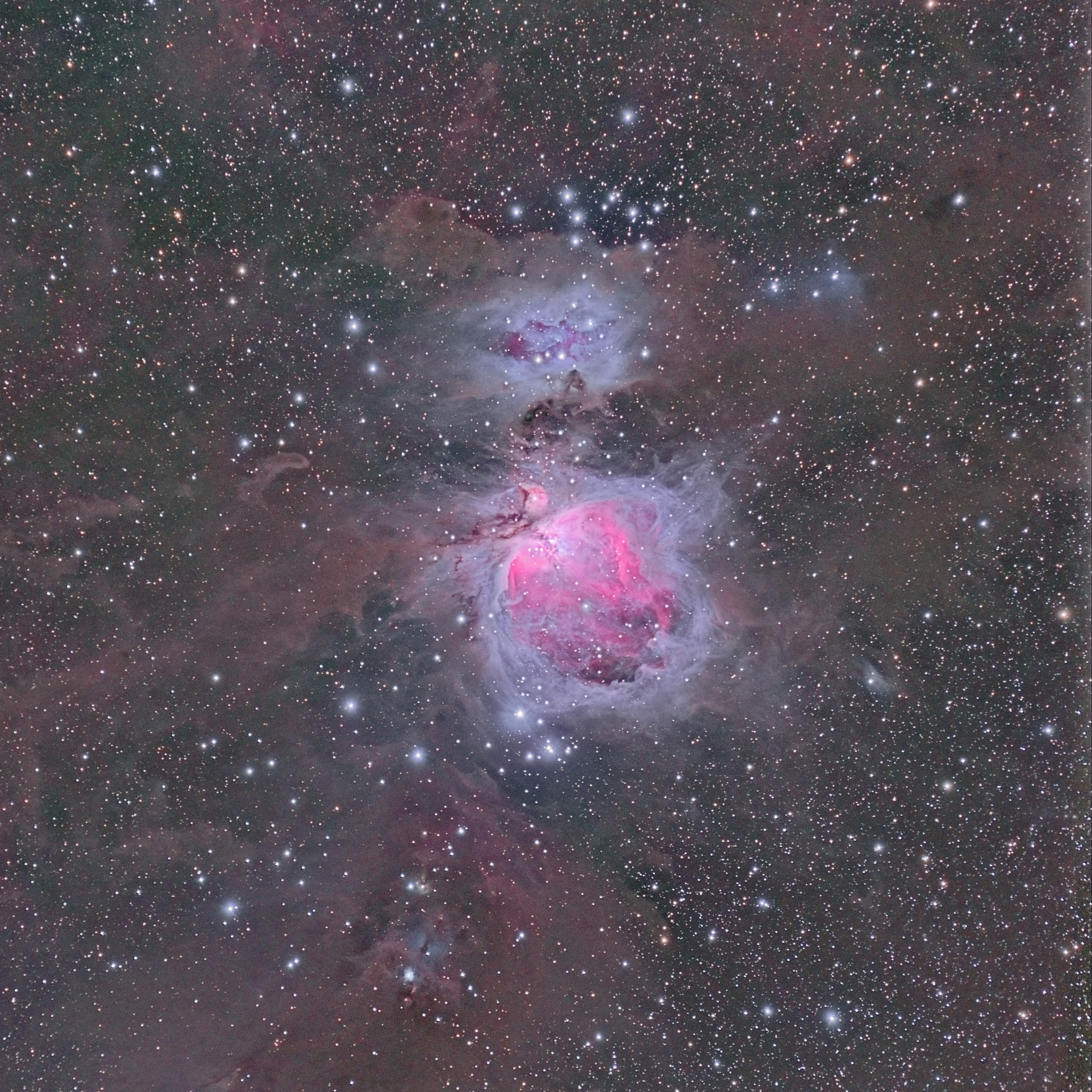 Was für eine malerische Ansicht die Filamente dunklen Staubs und bunt leuchtenden Gases doch bieten! Kein Wunder also, dass sich der Orion-Nebel solcher Beliebtheit erfreut! Als eines der nächstgelegenen und aktivsten Stern-Entstehungsgebiete findet man den Orion-Nebel gleich unterhalb der drei Gürtelsterne des Orion. Mein Ziel mit dieser Aufnahme war es, nicht nur das extrem helle Trapezium sichtbar zu machen, sondern auch die zahllosen Stoßwellenfronten in den Gaswolken zu zeigen.
