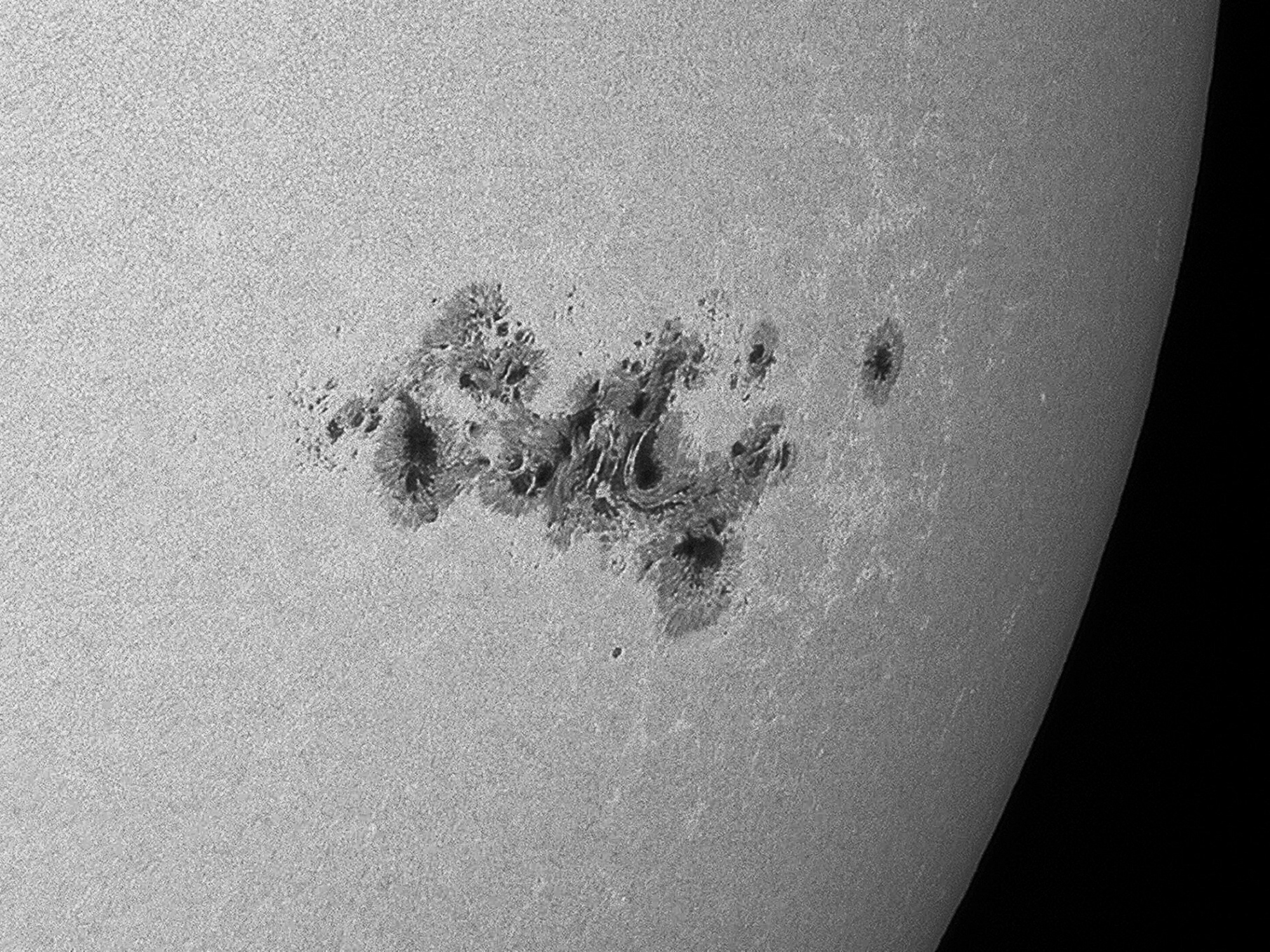 Endlich ein Sonnenfleck mit reichlich Details. Vor allem die vielen Lichtbrücken sind sehr auffällig. Langsam nähert er sich dem Rand, da kommen dann die photosphärischen Fackelgebiete auch ohne Spezialfilter zum Vorschein.