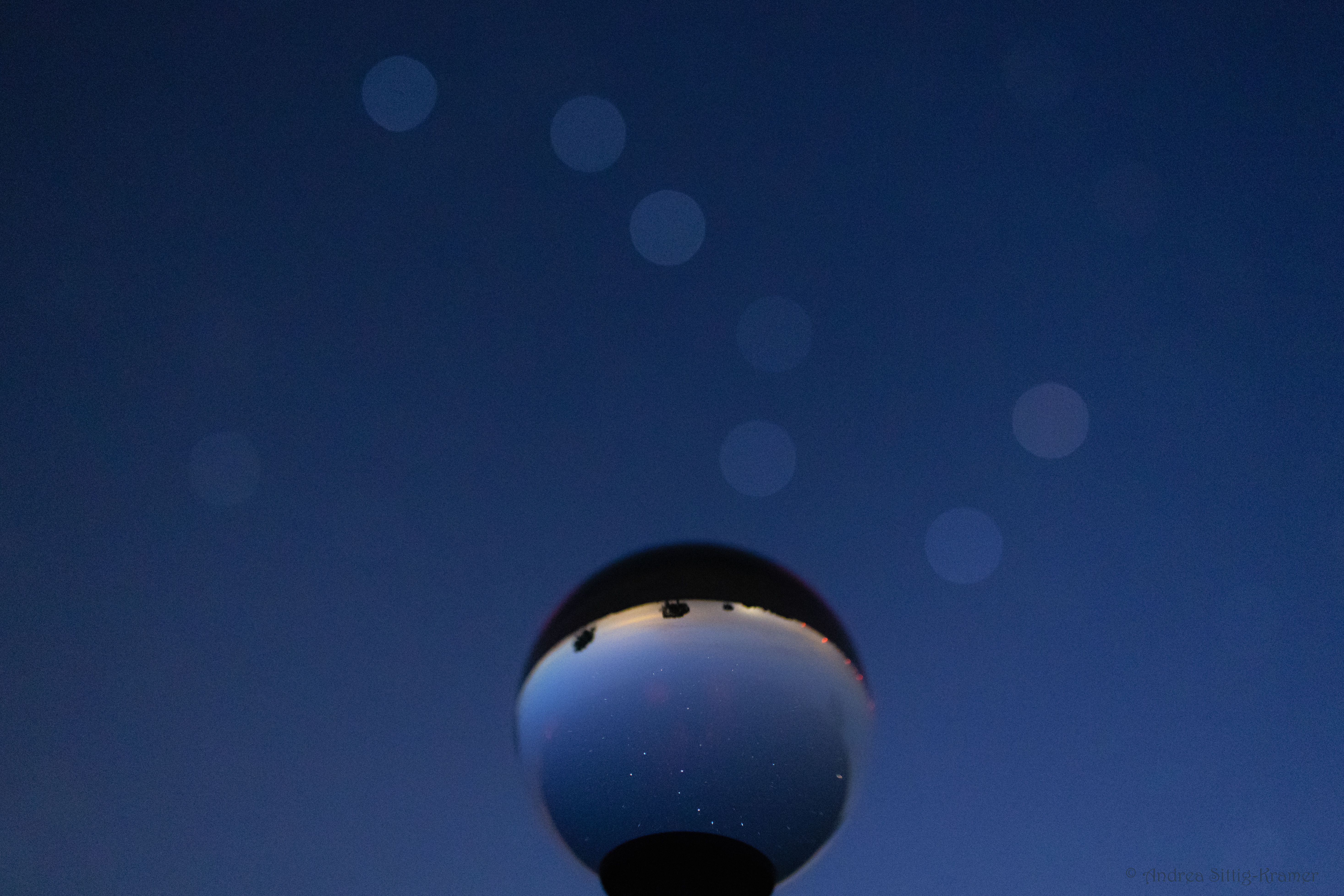 Die sternenklare, warme Sommernacht am 3./4. Juli 2025 nutzte ich für experimentelle Fotografie des nächtlichen Himmels mit meinem Lensball. Meine erste Wahl fiel auf den Großen Wagen, der auffälligste und bekannteste Asterismus im Sternbild Großer Bär. Lensball und Kamera habe ich so ausgerichtet, dass dies Kasten- und Henkelsterne durch Unschärfe als recht große Leuchtpunkte genau über der Vollglas-Linse am Himmel positioniert sind. Der Wagen steht in der Glaskugel unten auf dem Kopf. Den Fokus der Kamera habe ich auf ebendieses gespiegelte Bild gerichtet. Am Horizont, der nur im Lensball abgebildet ist, sind einige Bäume und ein schmales Band leuchtenden Nachtwolken zu sehen, sowie die roten Lichtpunkte von Windkrafträdern.