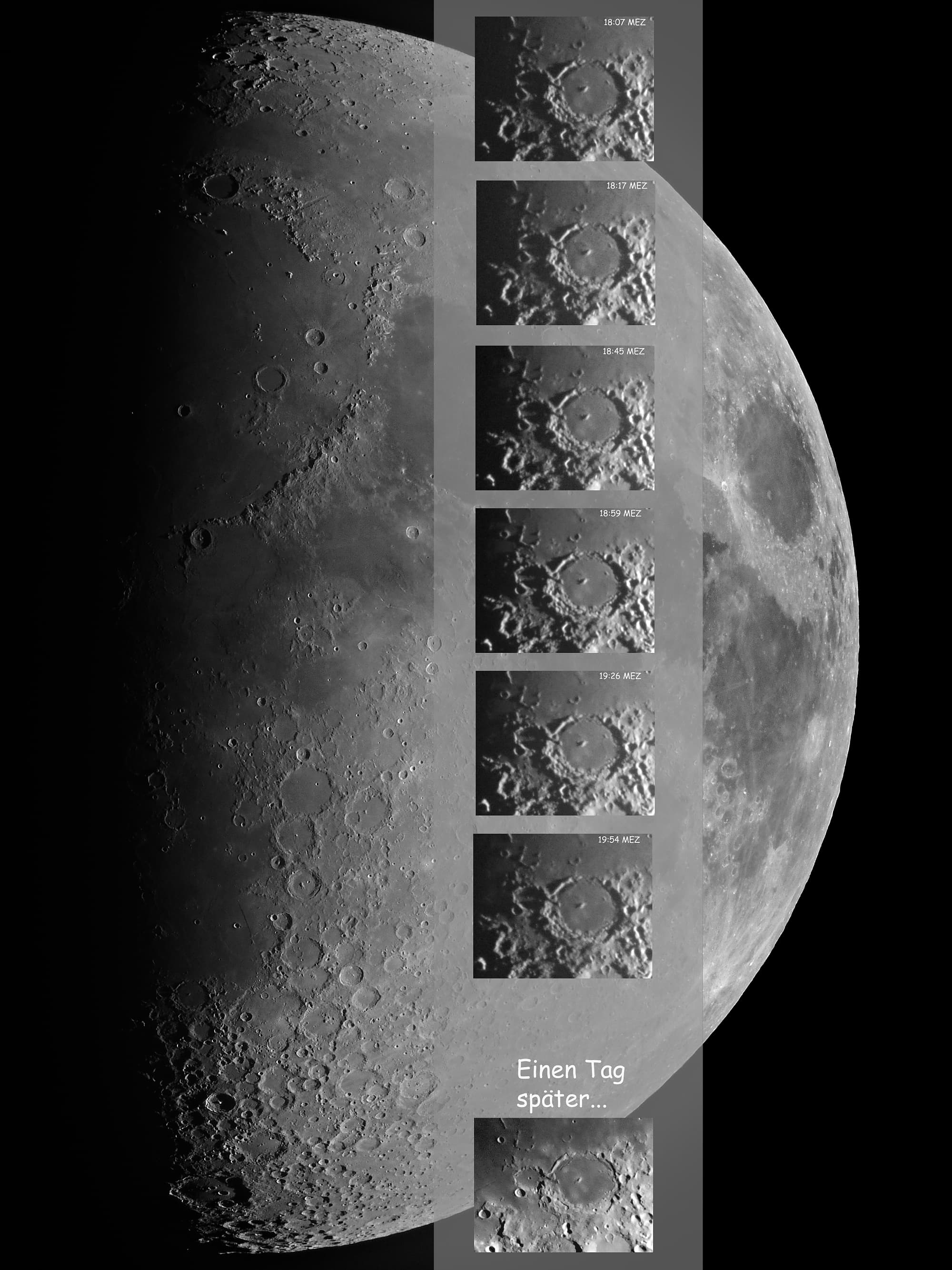 Am 13. Februar 2019 ergab sich mal wieder eine Gelegenheit, den Hesiodus-Lichtstrahl auf dem Mond zu beobachten, und das zu einer günstigen Zeit am Abendhimmel. Auch stand der Mond sehr hoch, dank Rekordwerten in der Deklination, beste Voraussetzungen für spannende visuelle und fotografische Beobachtungen. Ich habe mal versucht, einen interessanten zeitlichen Ablauf darzustellen, das Hintergrundbild wurde auch an diesem Abend aufgenommen.