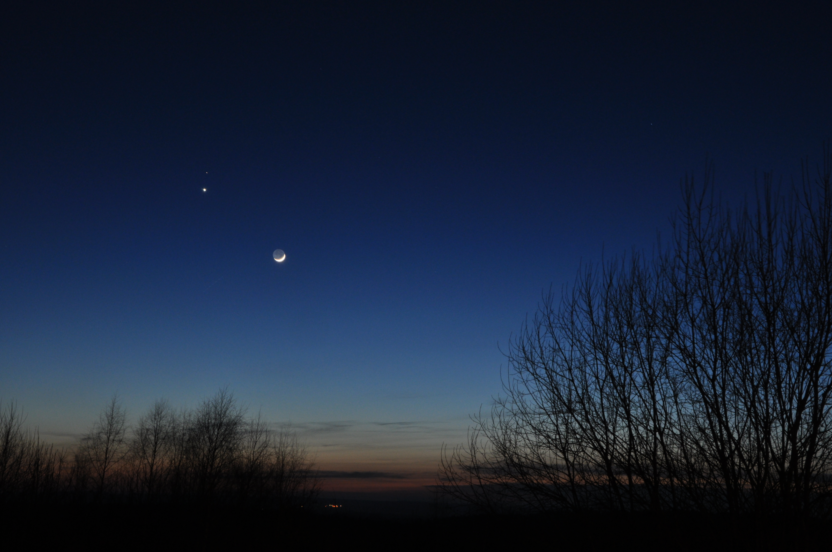 Am 20.Februar war der Abendhimmel besonders schön und so konnte nach Sonnenuntergang man den jungen Mond zusammen mit Venus und Mars bewundern. So unterbrach ich meine Fahrt auf der A9 am Rasthof Pegnitz und hielt dieses schöne Zusammentreffen fest..