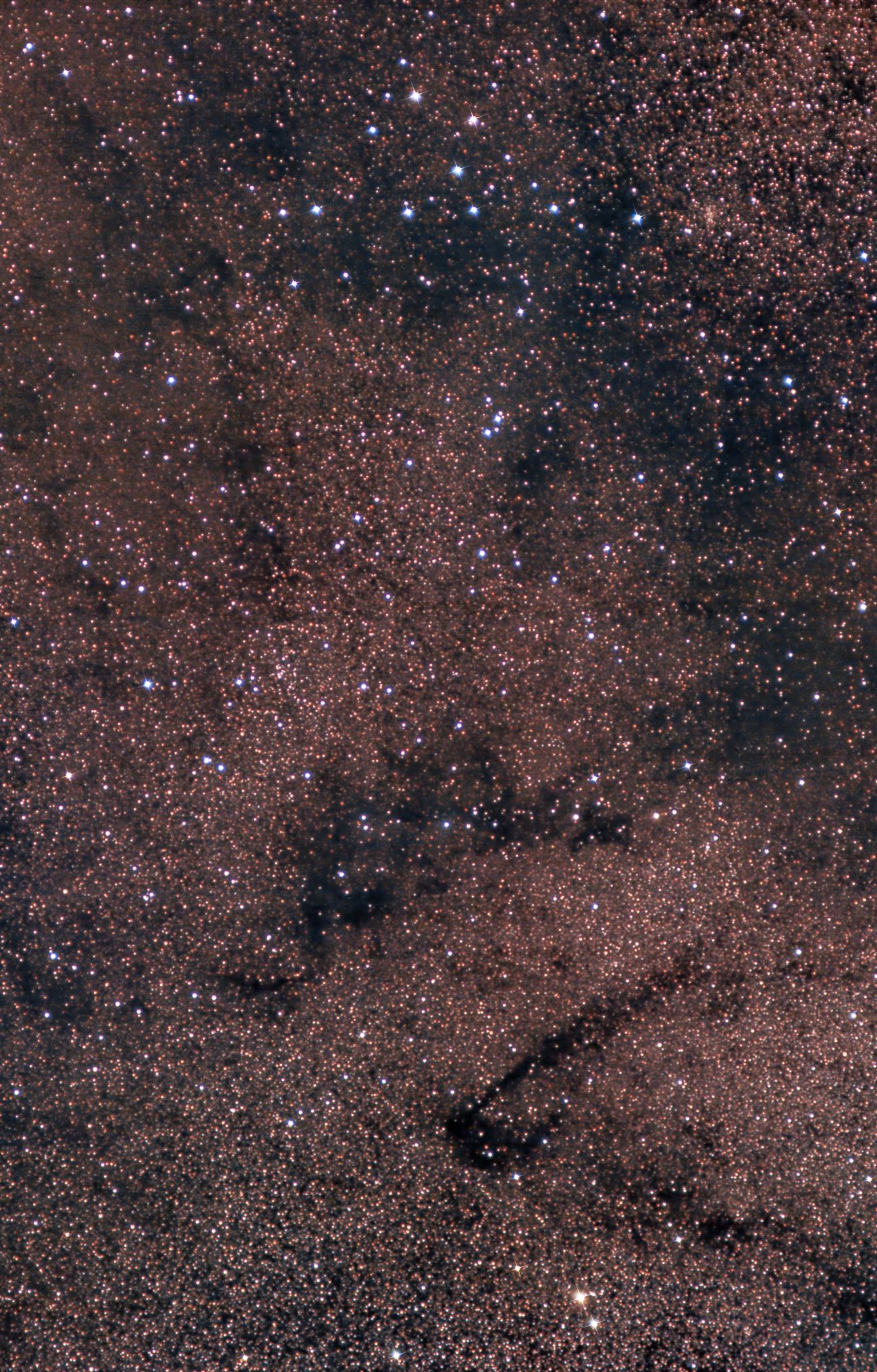 Ein "zerrissenes" Stück der Milchstraße hängt am Kleiderbügel. Starke Lichtverschmutzung: Dunkelheit: Bortles Klasse 8. 10 dark, 30 flat, 10 dark flat. Keine Nachführung.