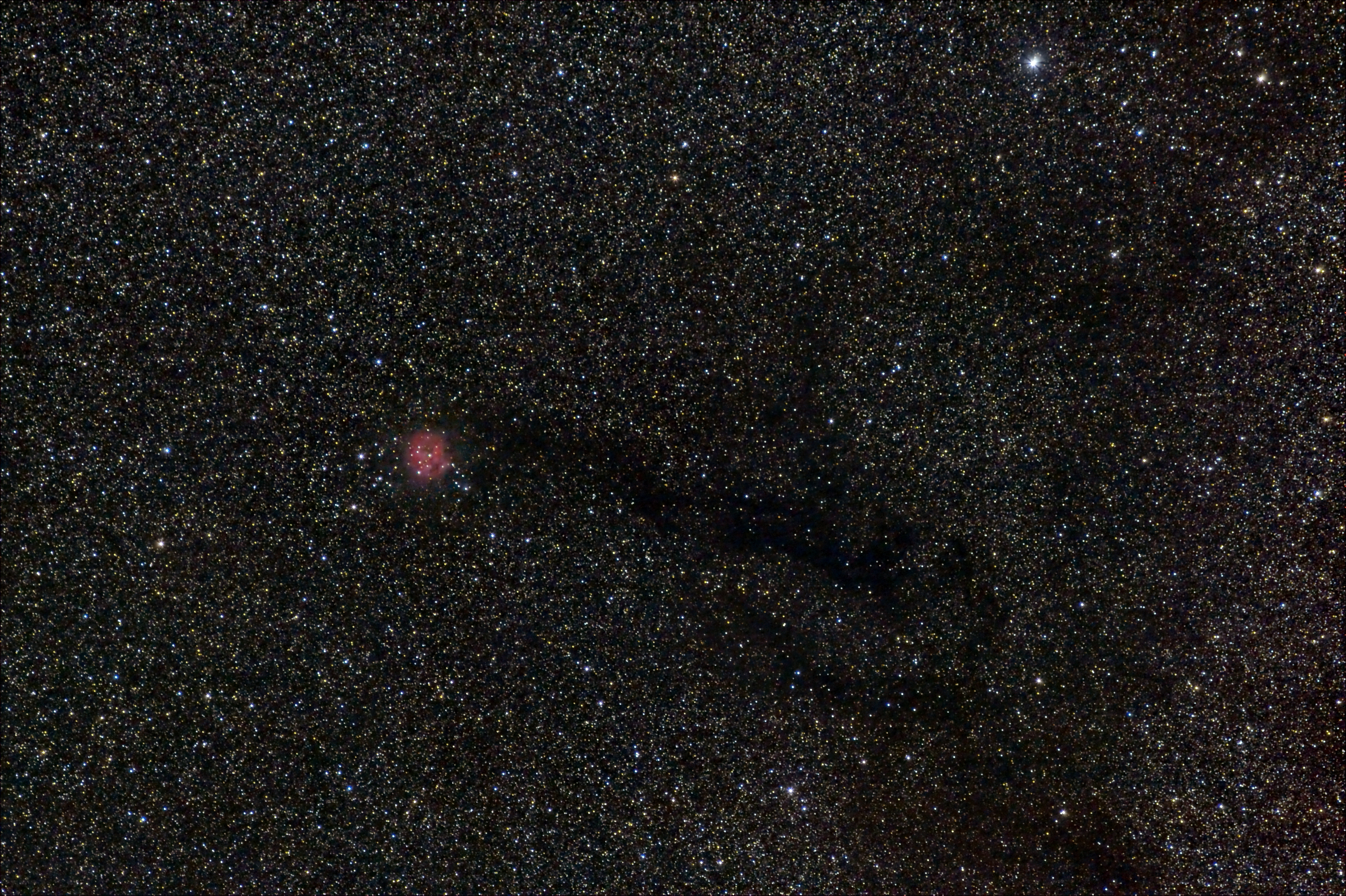 Der Kokonnebel IC 5146 im Sternbild Schwan ist trotz seiner unauffälligen Größe ein sehr hübscher und markanter Nebel, wobei er zugleich Emissionsnebel als auch Reflexionsnebel ist. Der Kokonnebel ist etwa 3000 Lichtjahre entfernt. Besonders reizvoll ist die sich ihm wie eine Schleppe anschließende »Zigarre«, der Dunkelnebel Barnard 168, welcher die dahinter liegenden Sterne des Milchstraßenbandes verdeckt. Mit 300 mm Brennweite aufgenommen schwebt der Kokonnebel samt Anhang wunderbar im Sternenmeer der Milchstraße, und zeigt doch schon einige Details im Nebel.