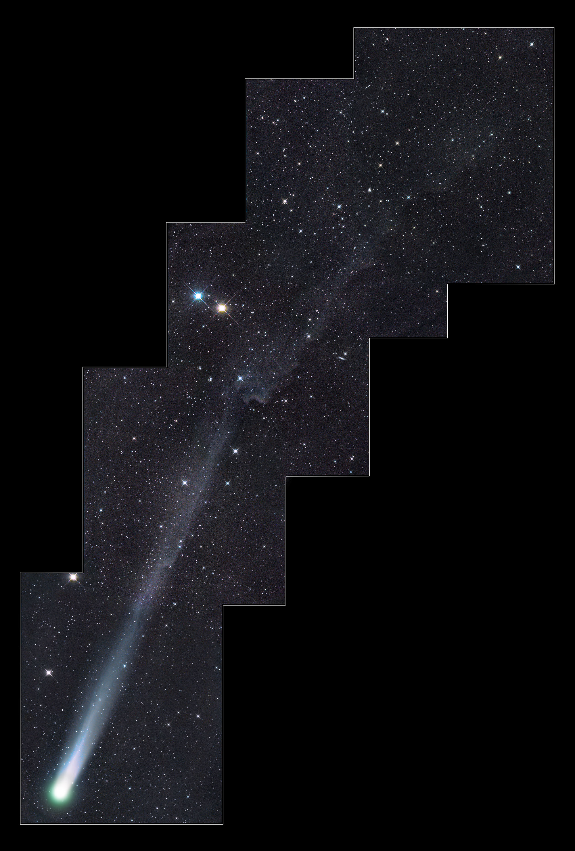Diese Aufnahme zeigt den Kometen C/2013 R1 (Lovejoy) in der Nacht von 5. Dezember 2013 von 4.00 bis 06.00 Uhr LT (- 03:00 Uhr 01:00 Uhr UT). Dies ist ein Fünf-Panel-Mosaik. Jedes Panel ist eine 1-min-LRGB-Kombination in bin 2x2. Der Kometenschweif erstreckt sich über 5 Grad. Durch die schnelle Bewegung der Strukturen im Schweif des Kometen war kein Stacking anwendbar.