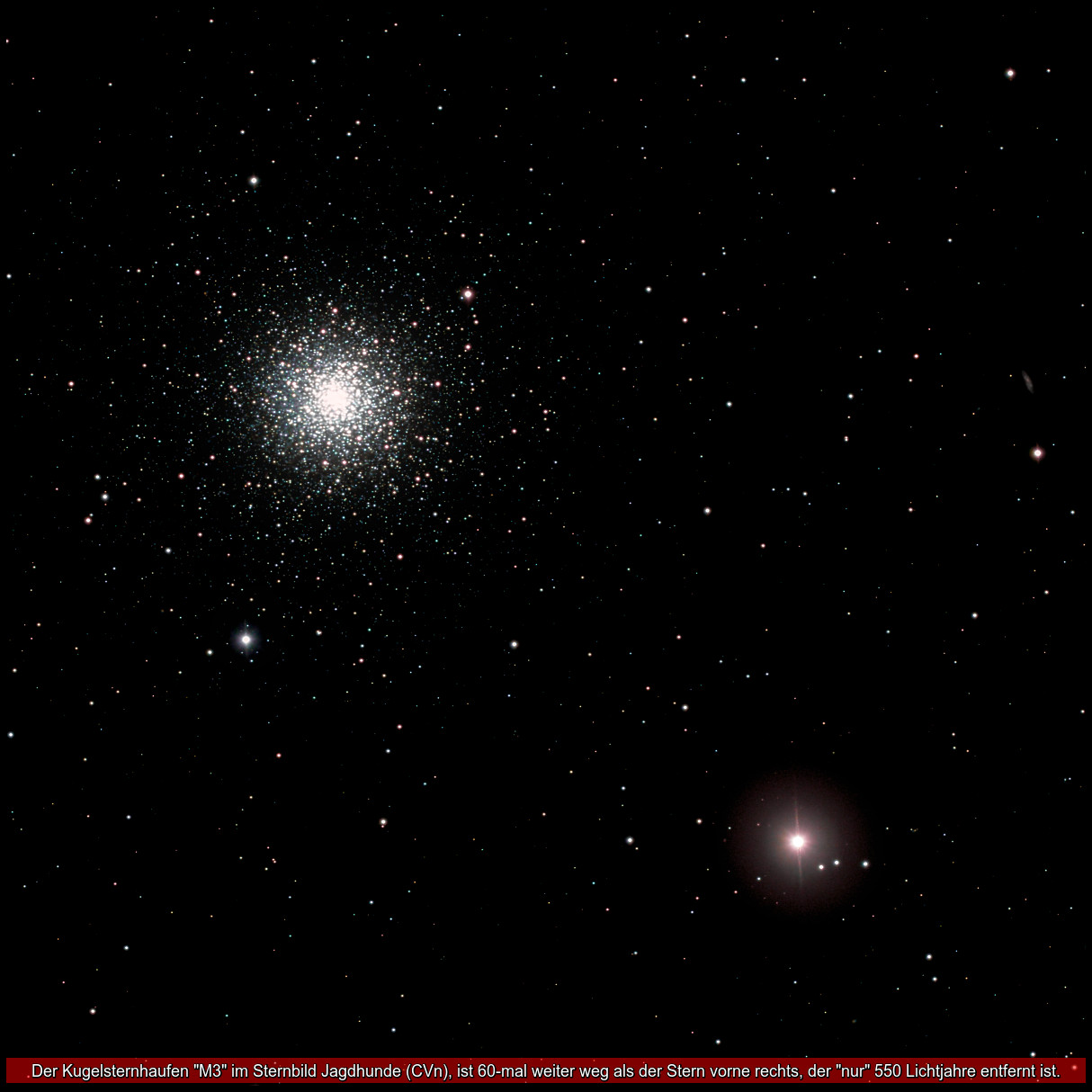 Natürlich kann mein 90/500 Astrograph einen Kugelsternhaufen wie M3 nicht bis in den Kern auflösen. Ich muss aber zugeben, dass mir dieser Anblick den Verstand raubt, wenn ich mir bewusst mache, was ich da sehe: Ein galaktischer Schneeball aus offenbar dicht komprimierten Sternen in 34000 Lichtjahren Entfernung! Messier 3 enthält schätzungsweise 500000 bis 1 Million Sterne. In der dichten Kernregion können Sterne nur 0,1 Lichtjahre – etwa 1000 AU – oder noch weniger von einander entfernt sein. Dies bedeutet, dass sie hundertmal dichter »gepackt« sind als die Sterne in der Nachbarschaft unserer Sonne. Auch der Durchmesser von M3 ist beeindruckend: Satte 180 Jahre müsste man mit der Geschwindigkeit des Lichts reisen, wollte man ein Mal durch diese Sternansammlung hindurch fliegen. Mit einer Distanz von 34000 Lichtjahren, ist M3 60-mal weiter von unserem Sonnensystem entfernt als das Doppelstern-System HIP 66725, das unten rechts im Bild prominent zu sehen ist – in einer Entfernung von »nur« 550 Lichtjahren.