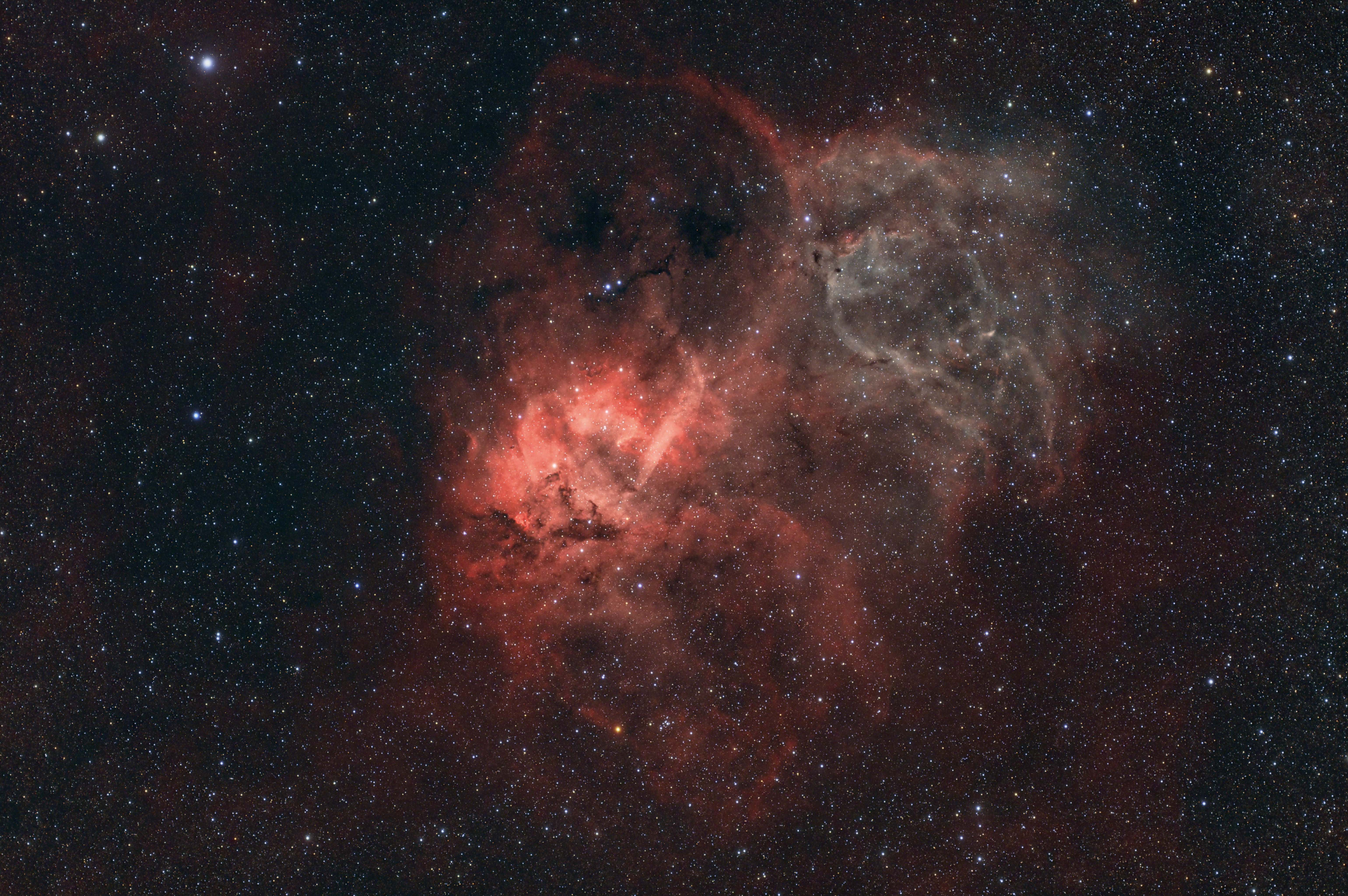 Der Löwennebel oder Sharpless 2-132, ein Emissionsnebel im Sternbild Kepheus. Das schöne Wetter hat mich dazu veranlasst das Teleskop und die Kamera mal zwei Nächte auf der Terrasse laufen zu lassen. Das Bild ist eine Mischung aus Dual-Schmalband Daten, und den Antlia RGB Ultra Lichtverschmutzungsfilter Daten.