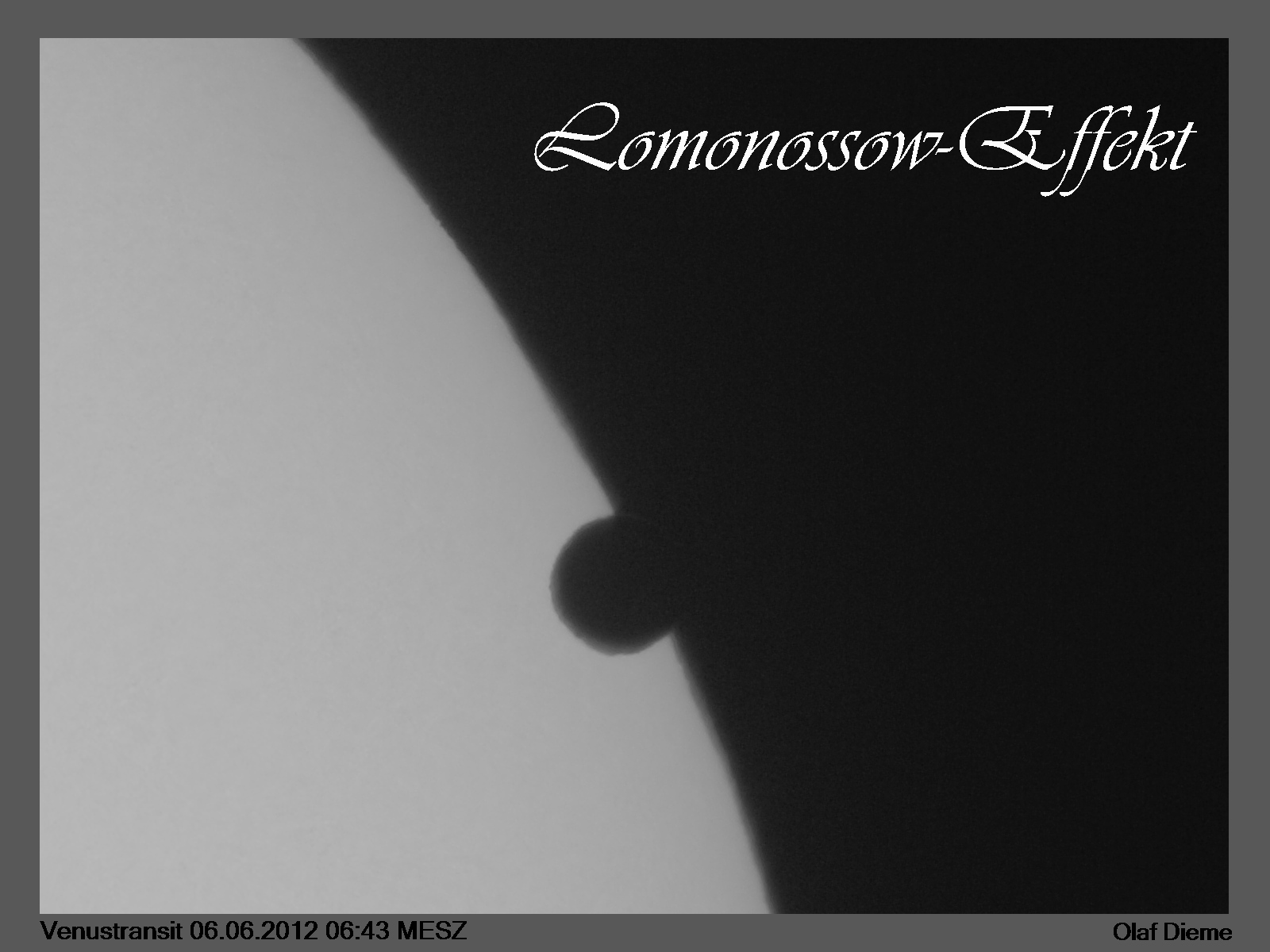 ..oder auch Lomonossow-Ring bzw. Lomonossow-Bogen genannt, ist ein Aufleuchten der Venusatmosphäre (der Teil der sich bereits außerhalb der Sonne befindet) beim Durchqueren des Sonnenrandes, hier im oberen Bereich der bereits ausgetretenen Venuskugel schwach zu erkennen. Es ist ein Nachweis, das die Venus eine Atmosphäre besitzt. Bei einem Merkurdurchgang kommt er nicht vor. Der Wissenschaftler Lomonossow entdeckte diesen Effekt im Jahr 1761. Dieser Effekt wird nicht so oft fotografiert, so das ich sehr froh war, ihn doch aufnehmen zu können, vor allem, da meine Anreise von Bochum hin und zurück 900 km lang war.