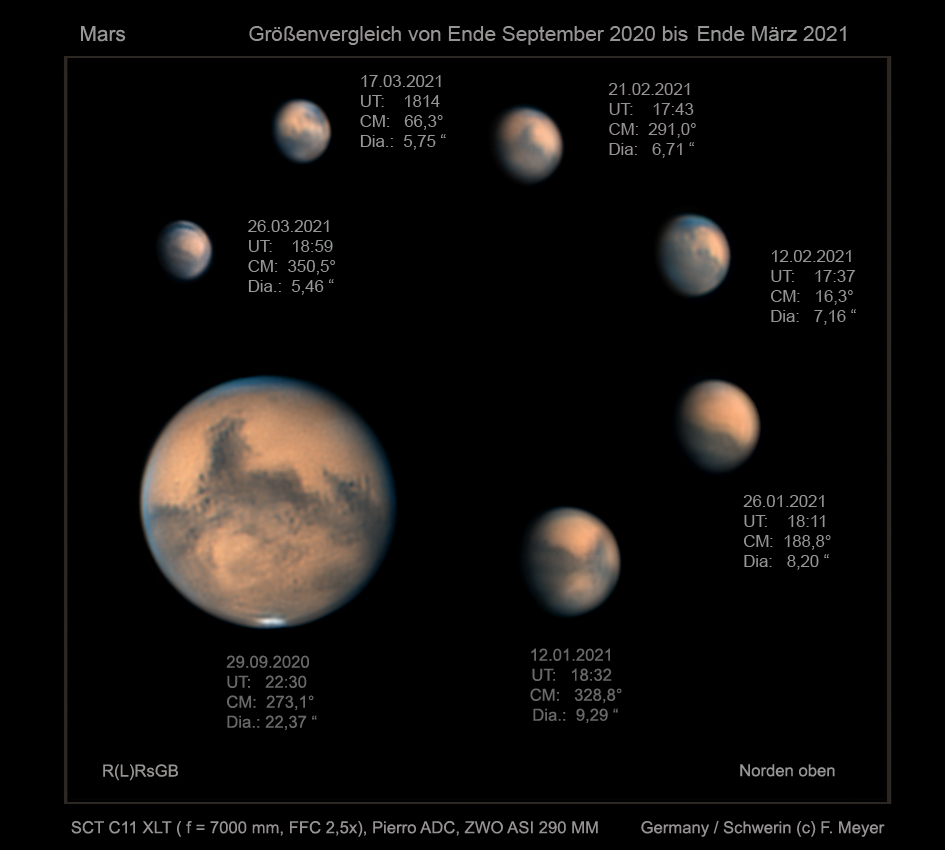 Leserbilder Astronomie: Der Mars – Abnahme seines scheinbaren Durchmessers von September 2020 bis März 2021