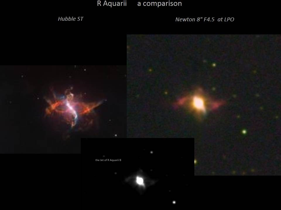 Hier ein Vergleich zwischen dem Weltraumteleskop Hubble und meinem 8-Zoll-, F4.5-Newton, die Ausdehnung des Objekts beträgt 2,0 x 1,2 Bogenminuten. Ced 211 stammt vom Hauptstern, der Jet kommt aus der Akkretionsscheibe von Komponente B (Weißer Zwerg!), Umlaufzeit 44 Jahre, Separation 0,05 Bogensekunden, Entfernung 1000 Lichtjahre.