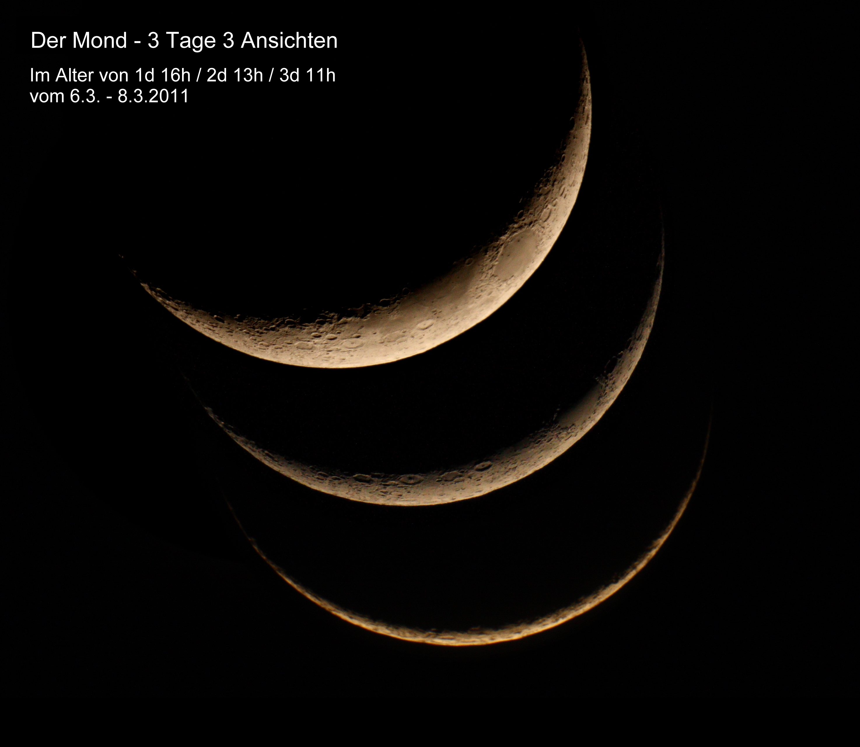 Die Montage entstand aus den ersten Tagen des aktuellen Mondzyklus vor dem größten Vollmond dieses Jahres. Das Wetter ist in meiner Region sonst nicht so großzügig, um an drei Folgetagen bei relativer Luftruhe die junge Mondsichel gut fotografieren zu können. Der momentan hohe Stand des Mondes auf der Ekliptik hat natürlich entscheidend zum Gelingen des Shootings beigetragen