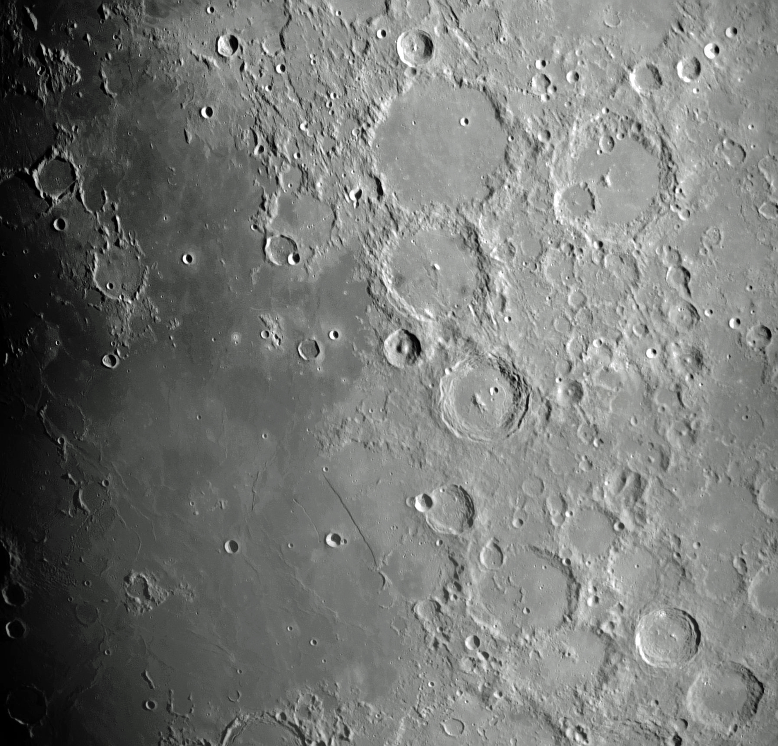 Die Mitte des Mondes mit der Langen Wand, einer 100 km langen Verwerfung. Beachtung verdient auch die Birt-Rille westlich davon, die vulkanischen Ursprungs ist. Im nördlichen Teil, der ungünstig beleuchtet war, bisektiert sie einen lunaren Dom.