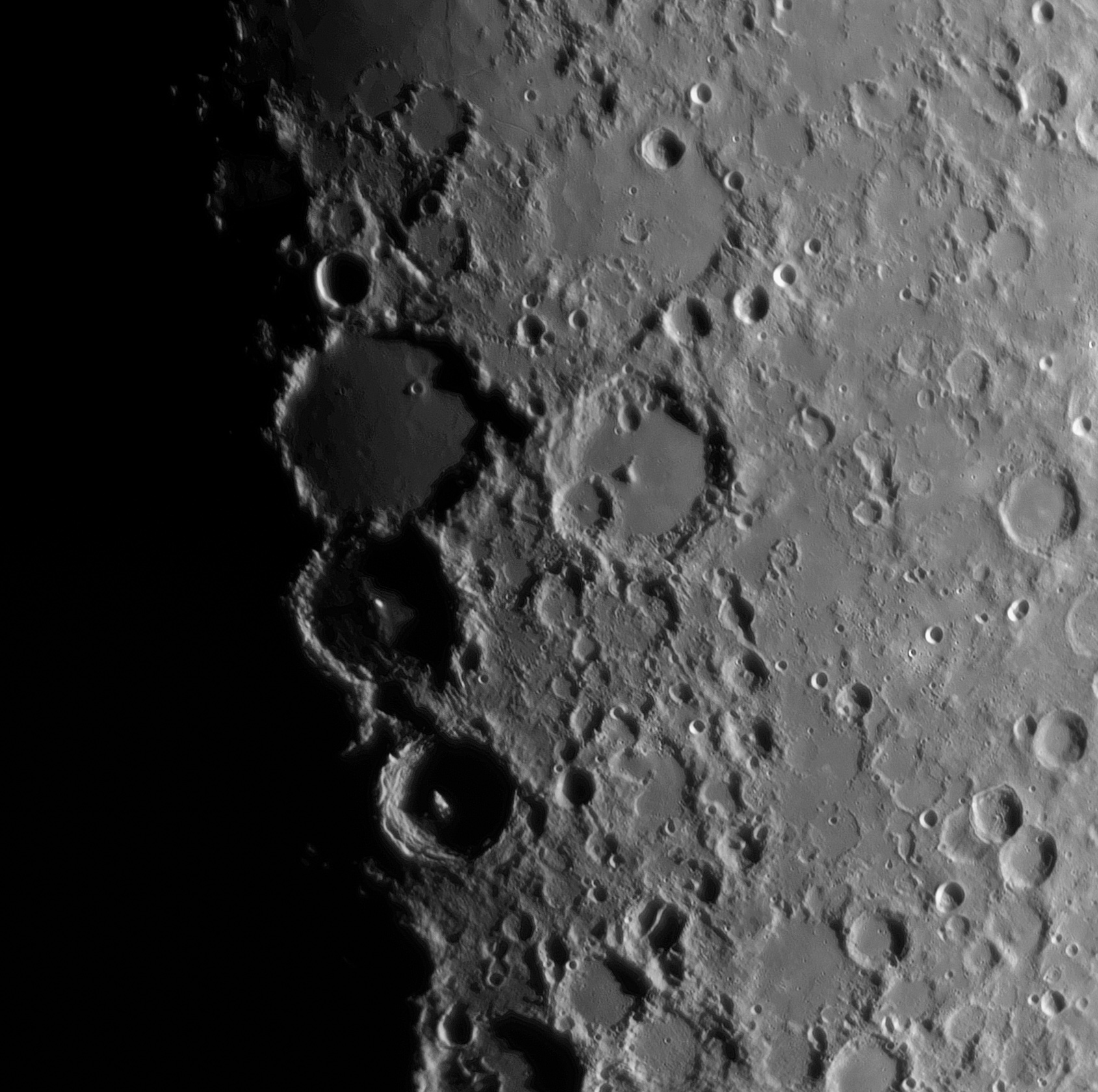 Das berühmte Monddreigestirn Ptolemäus, Alphonsus und Arzachel schält sich eben aus der Mondnacht und aus dem Zweibild-Mosaik. Übrigens haben Monddreigestirn und Kölner Dreigestirn rein gar nichts miteinander zu tun! Das Monddreigestirn ist nämlich auch außerhalb des Karnevals zu sehen und schunkelt nicht, es sei denn bei miserablem Seeing ...