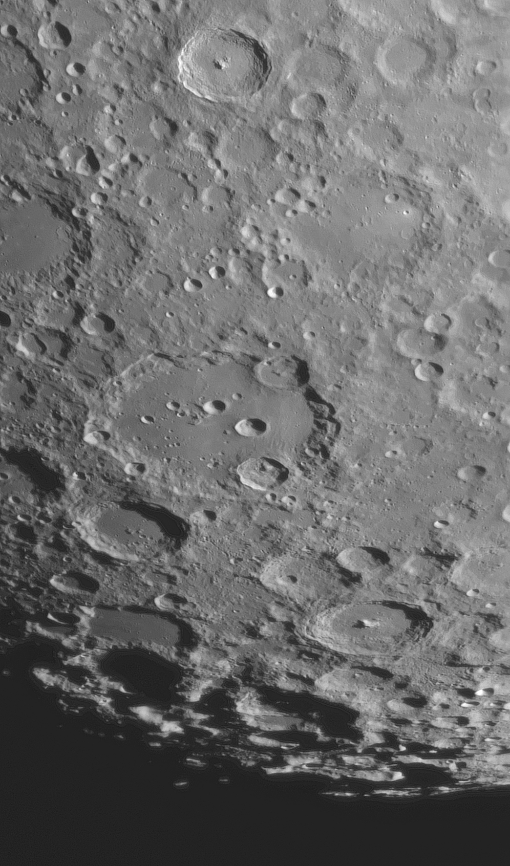 Die Krater Tycho und Clavius im tiefen Mondsüden sind Ausgangskrater der längsten Strahlen, die bei Vollmond in ihrer ganzen Ausdehnung zu sehen sind.