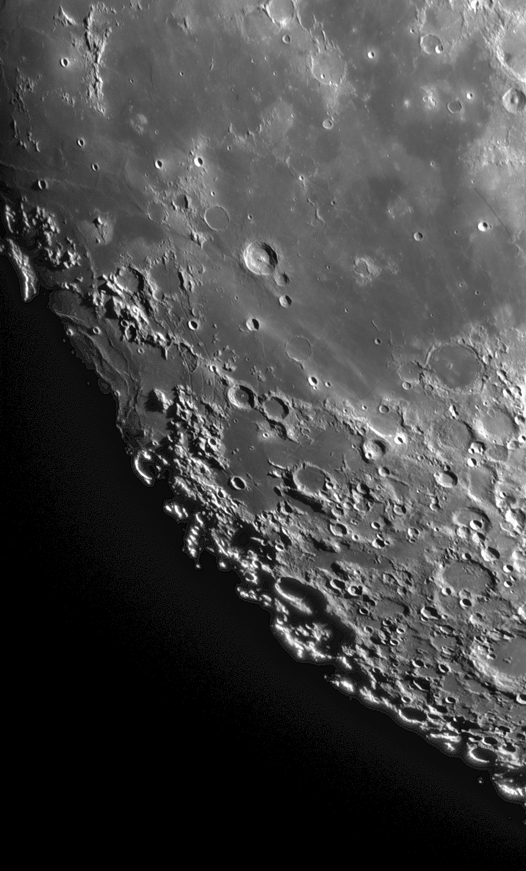 Eine selten fotografierte Mondregion schliesst sich gleich an den östlichen Kraterrand von Gassendi an. Der Megadom 'The Helmet' sieht aus wie ein Helm, der mit der Spitze nach unten zeigt. Er misst 40 km und ist 400 m hoch. Der Krater Bullialdus (61 km) ist Krater Kopernikus (96) en miniature. Unweit südlich der halb versunkene Krater Kies, der aussieht wie eine Bratpfanne. Südwestlich der berühmte Dom Kies Pi. Noch weiter südlich Krater Capuanus mit seinem Dom.