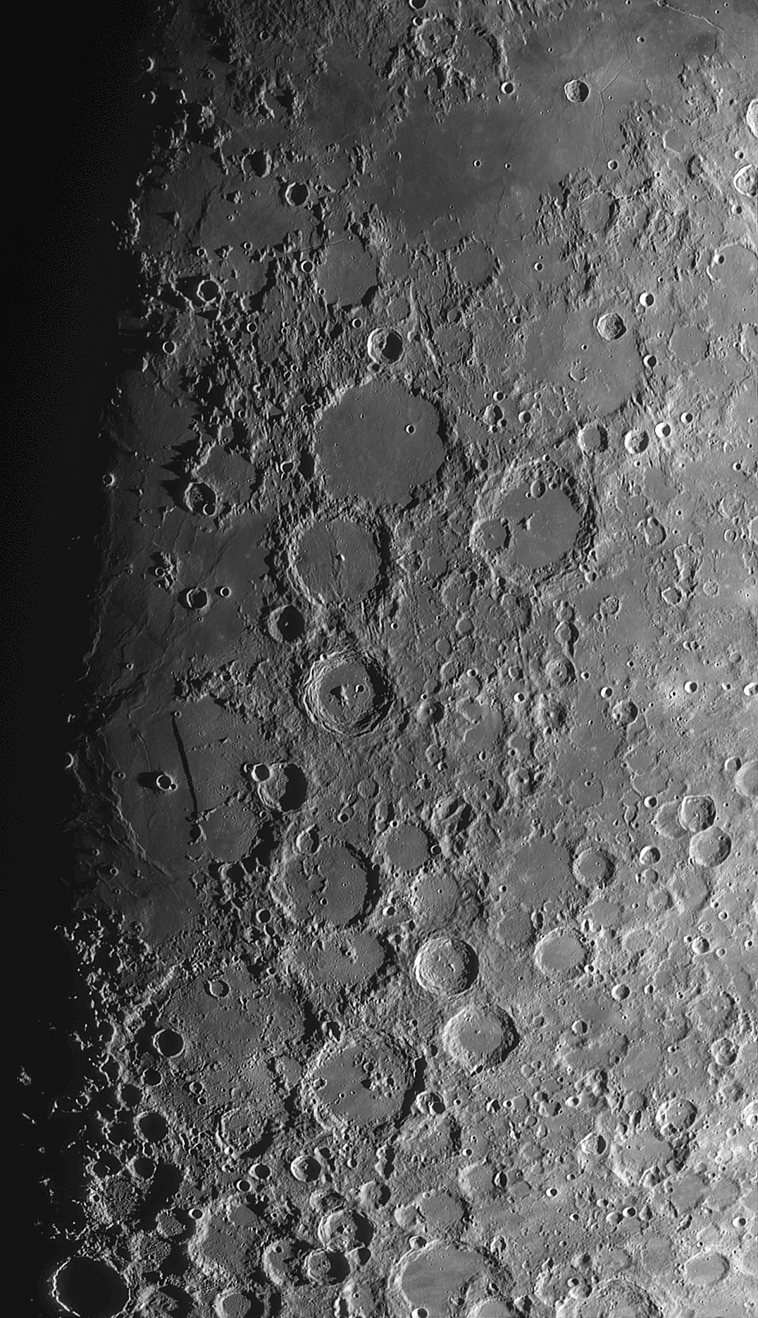 Von der Hyginus-Rille über die Lange Wand bis zu Tycho erstreckt sich diese Übersichtsaufnahme. Tychos Kraterrrand ist hell erleuchtet, während der Kraterboden noch in tiefer Dunkelheit ruht.