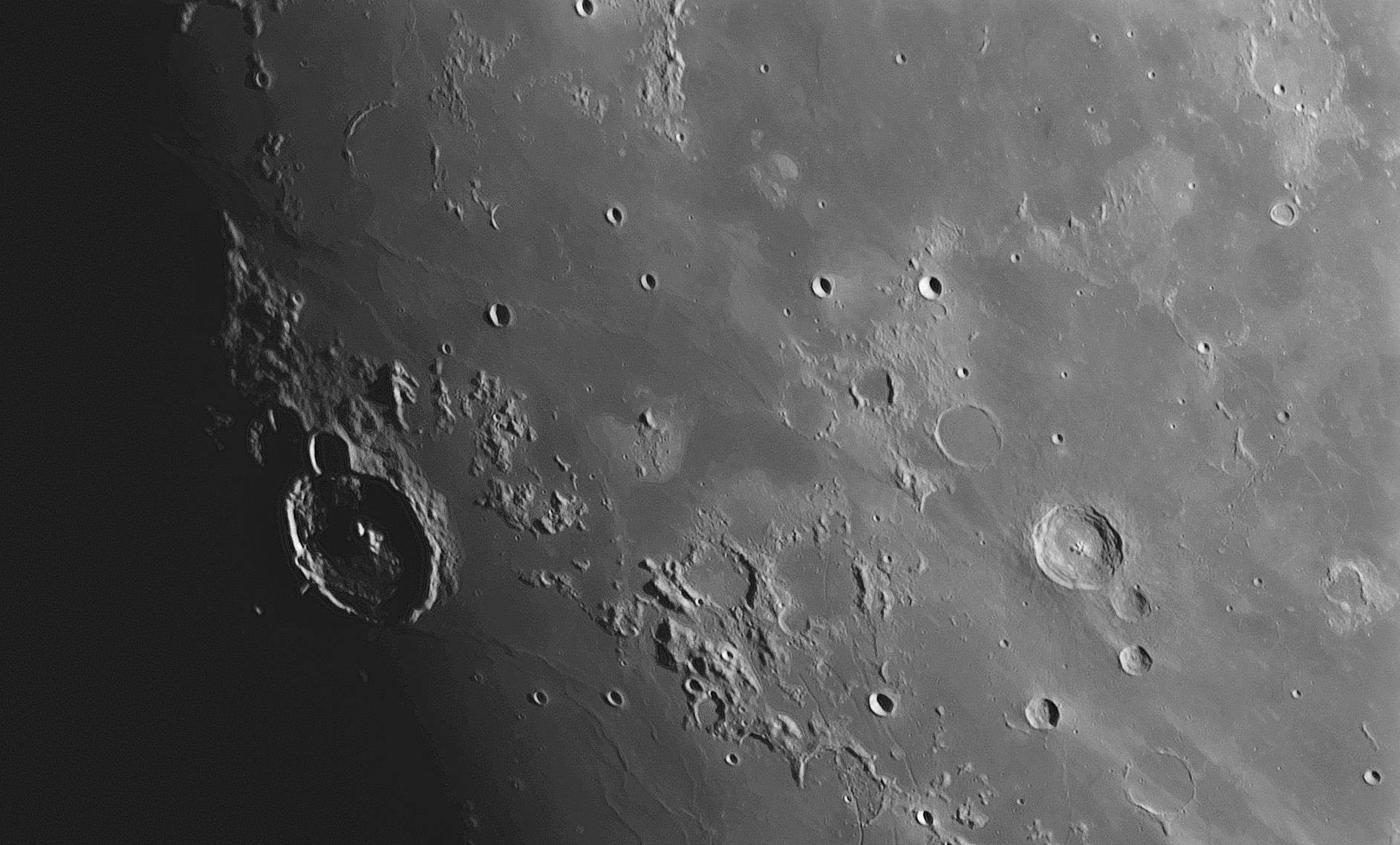 Von Gassendi bis Bullialdus. Während Bullialdus und Kies (mit vulkanischem Dom Pi) in vollem Sonnenlicht liegen, schält sich Gassendi gerade aus der Mondnacht.