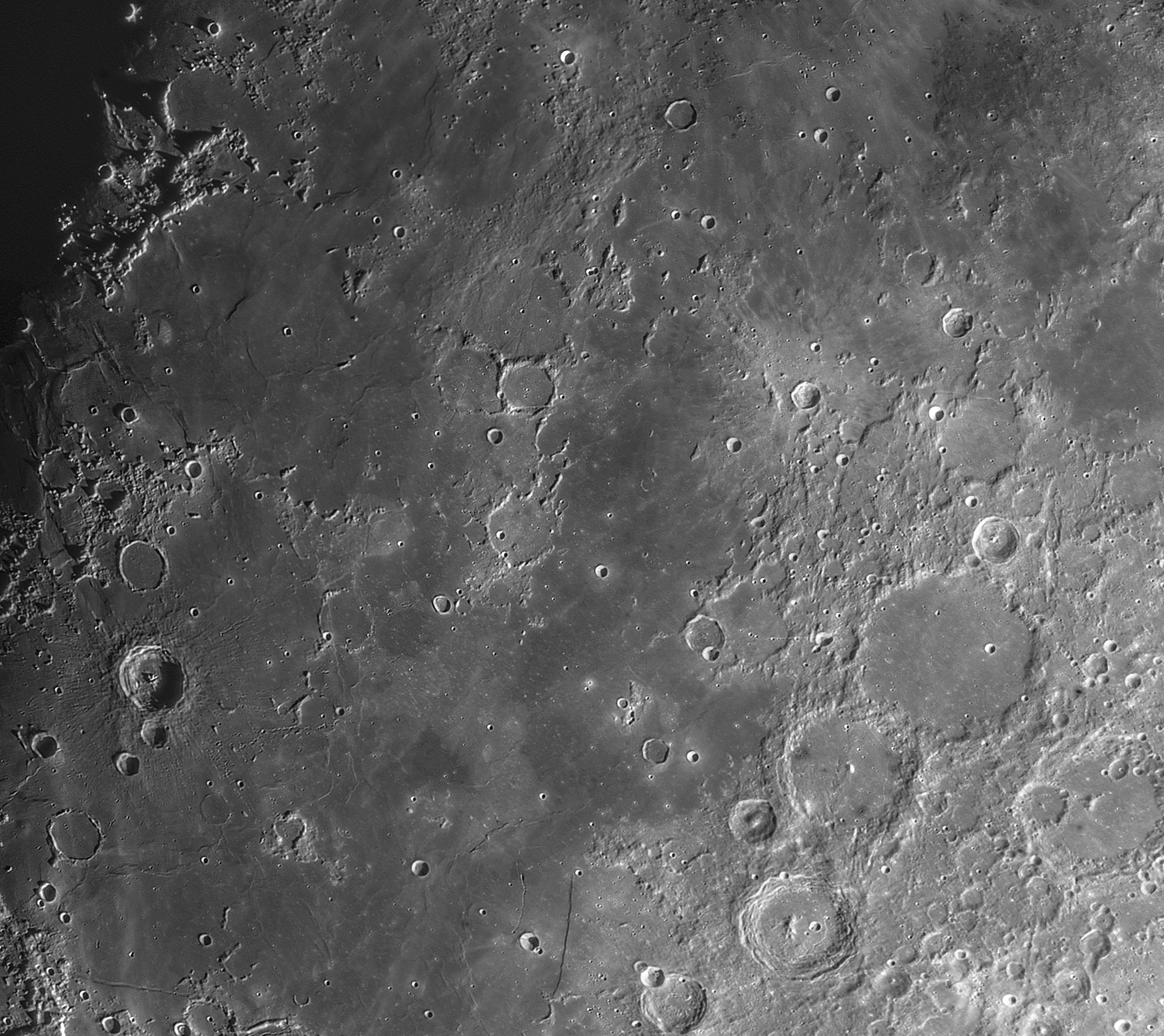 Mosaik aus sechs Bildern. Umrahmt von Ptolemäus und Konsorten auf der einen, Bullialdus und Kies mit seinem Dom auf der anderen Seite, liegt vor uns das Landegebiet von Apollo 14 bei Fra Mauro. Noch so gerade ist die Formation Turritella zu sehen.