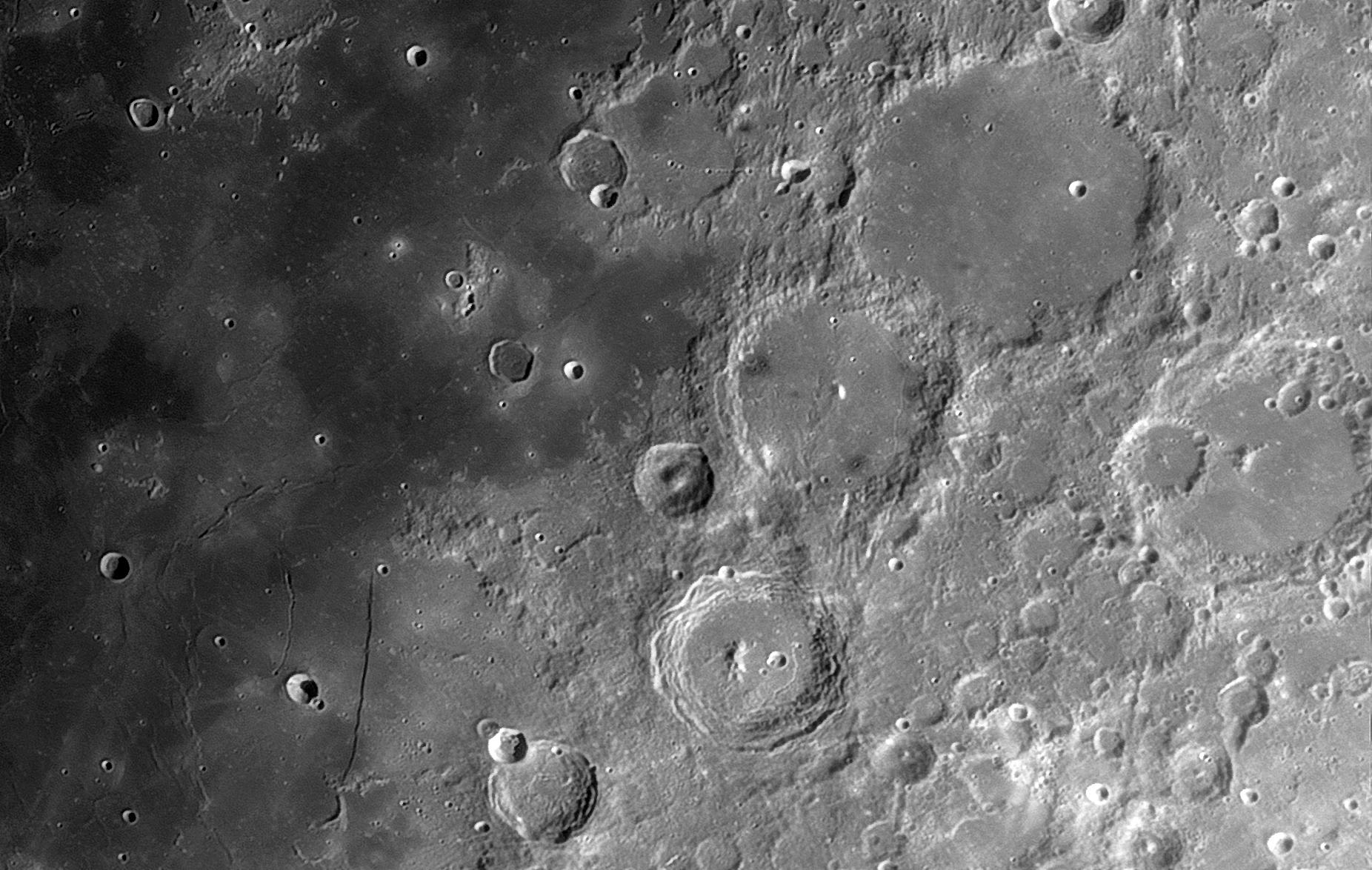 Immer wieder ein Genuss: Das Dreigestirn Ptolemäus-Alphonsus und Arzachel. In Alphonsus gut sichtbar die dunklen Austrittskrater der Lava, angeordnet in einem rechtwinkligen Dreieck. Links der drei Krater die Lange Wand mit der Birt-Rille.