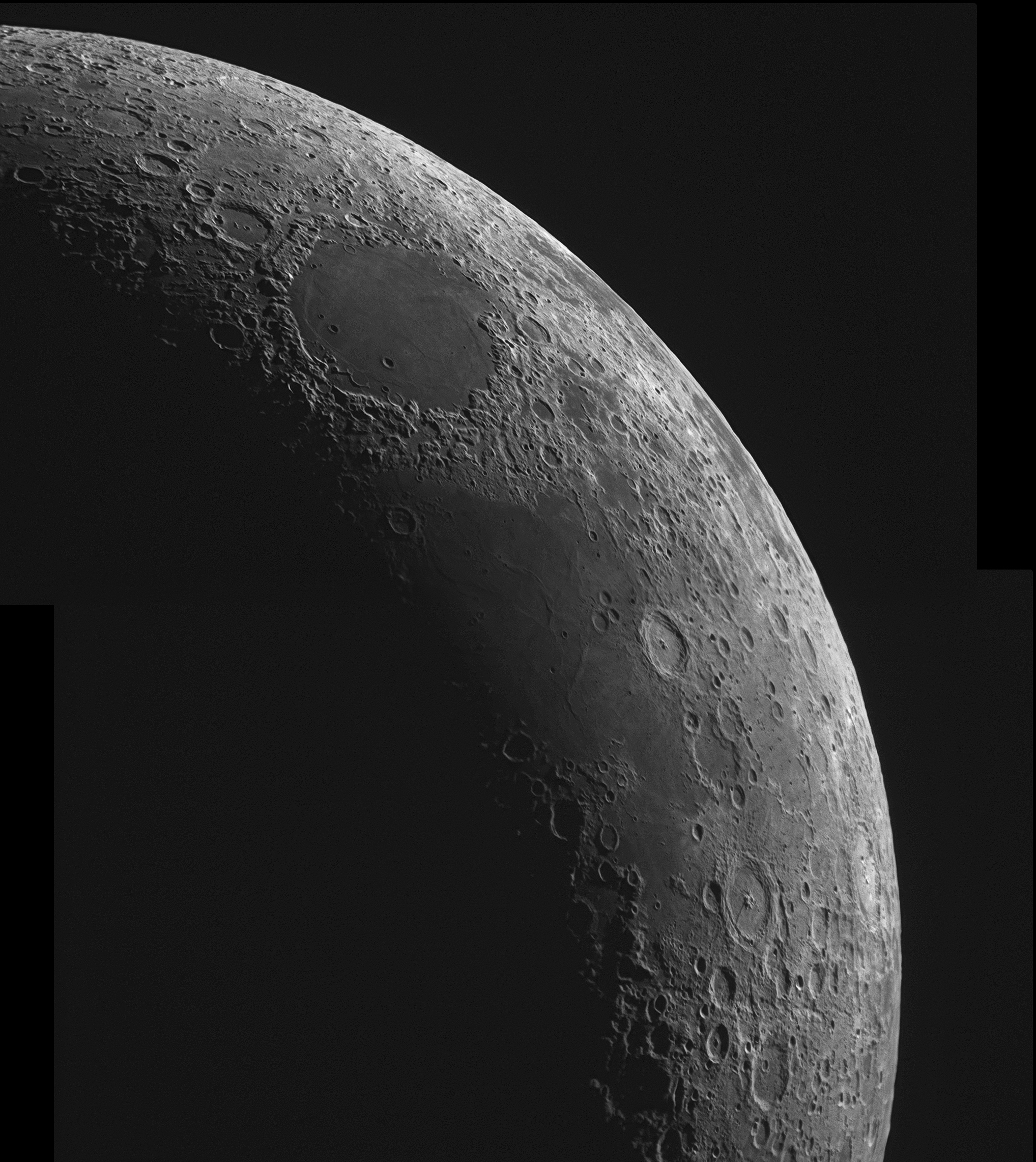 Auf diesem Panorama aus zwei Bildern ist das Vallis Snellius (unterhalb von Petavius) besonders deutlich zu erkennen. Es handelt sich dabei eigentlich um eine Kraterkette von 640 km Länge.