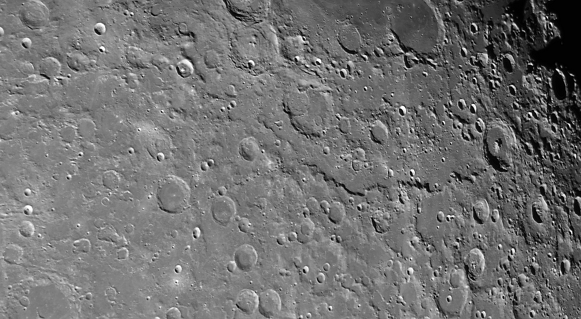 Immer wieder ein Blickfang: Rupes Altai. Die riesige Wand ist 430 Kilometer lang und bis zu 4000 Meter hoch. An ihrem Ende liegt Krater Piccolomini (88 Kilometer).