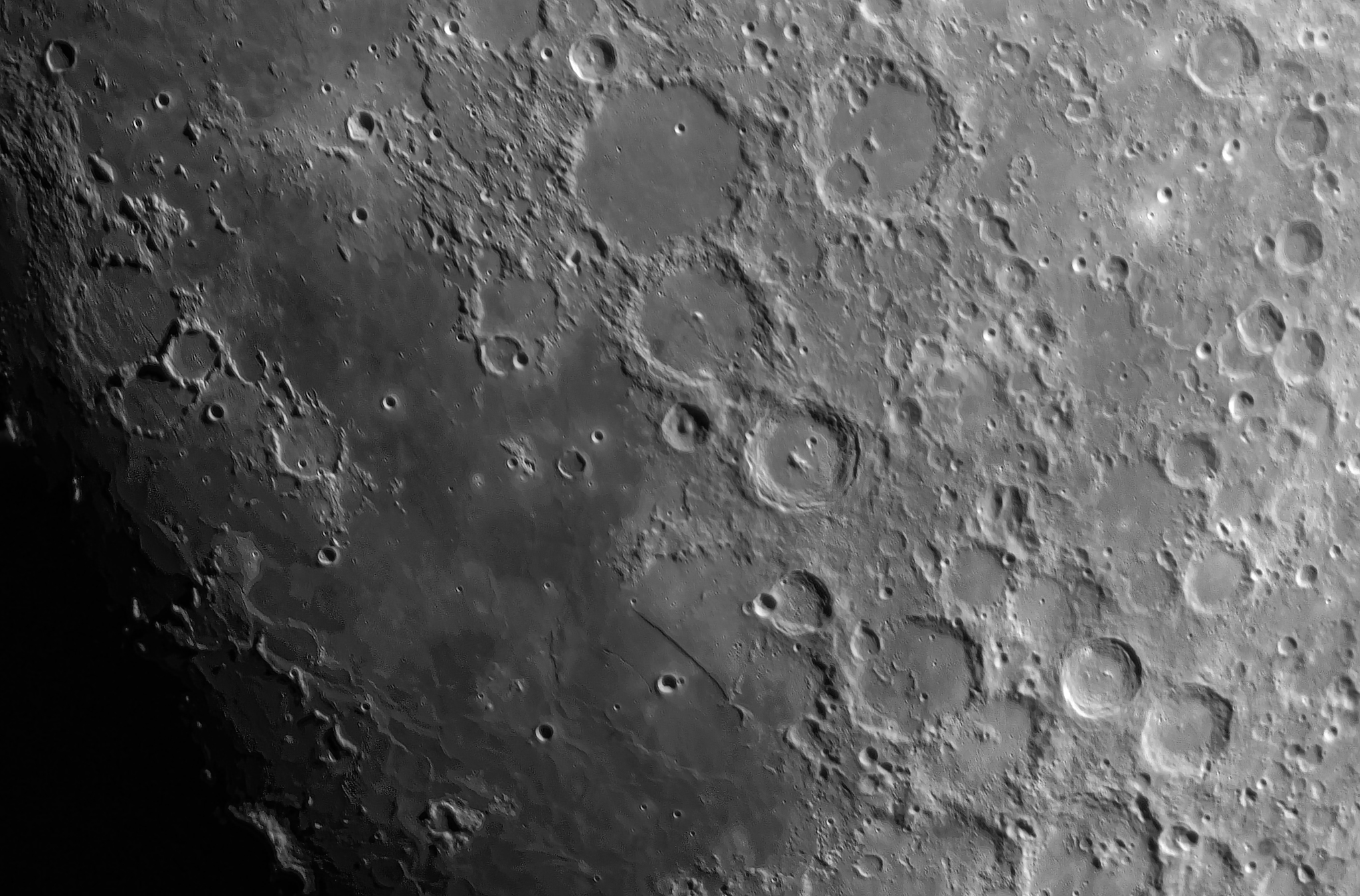 Der vertraute Mondanblick einen Tag nach dem Ersten Viertel, mit der Langen Wand. Panorama aus vier Bildern. Leider war das Seeing unterirdisch.