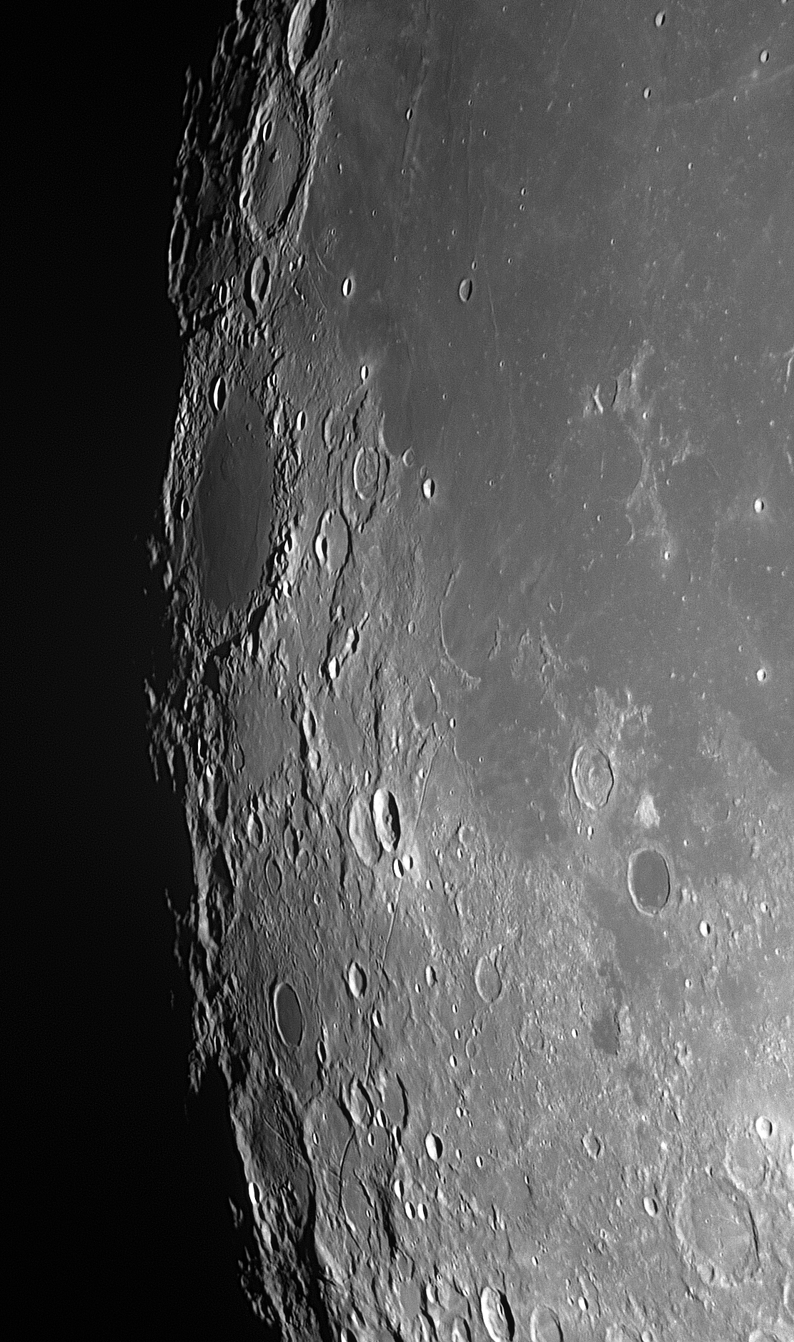 Nicht weit von Aristarch, dem hellsten Krater des Mondes, liegt Grimaldi, der dunkelste. Auffällig die vielen Rillen, besonders die Rimae Sirsalis und Hevelius.