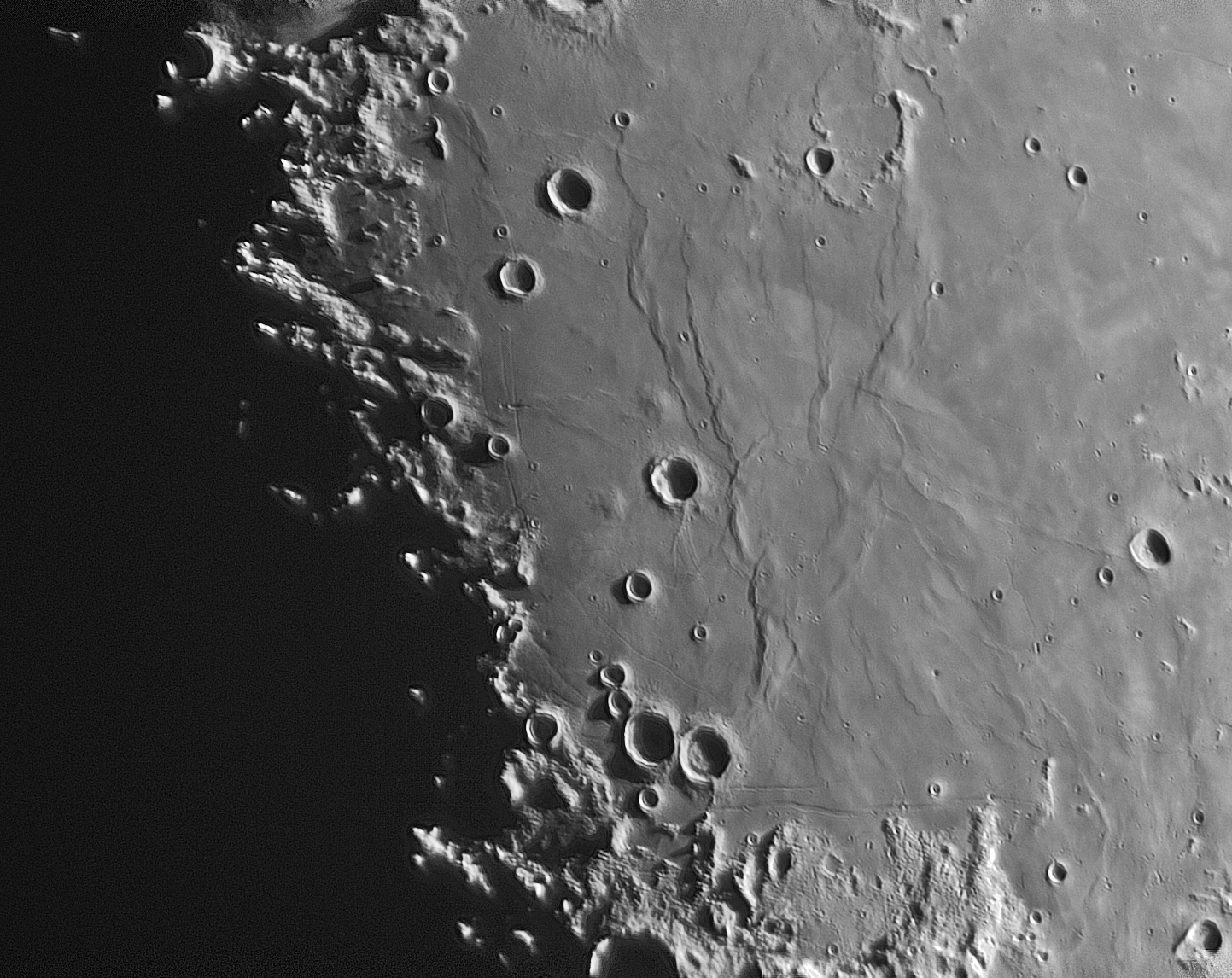 Krater Arago mit etwa schs bis sieben vulkanischen Domen. In der Mitte unten die Rimae Hypatia. Von rechts nach links zur unteren linken Bildecke zeigend die drei Kleinkrater Armstrong, Collins und Aldrin nördlich der Rillen. Zwischen den drei Kratern und den Rillen war der Landeplatz vom Lander Eagle.