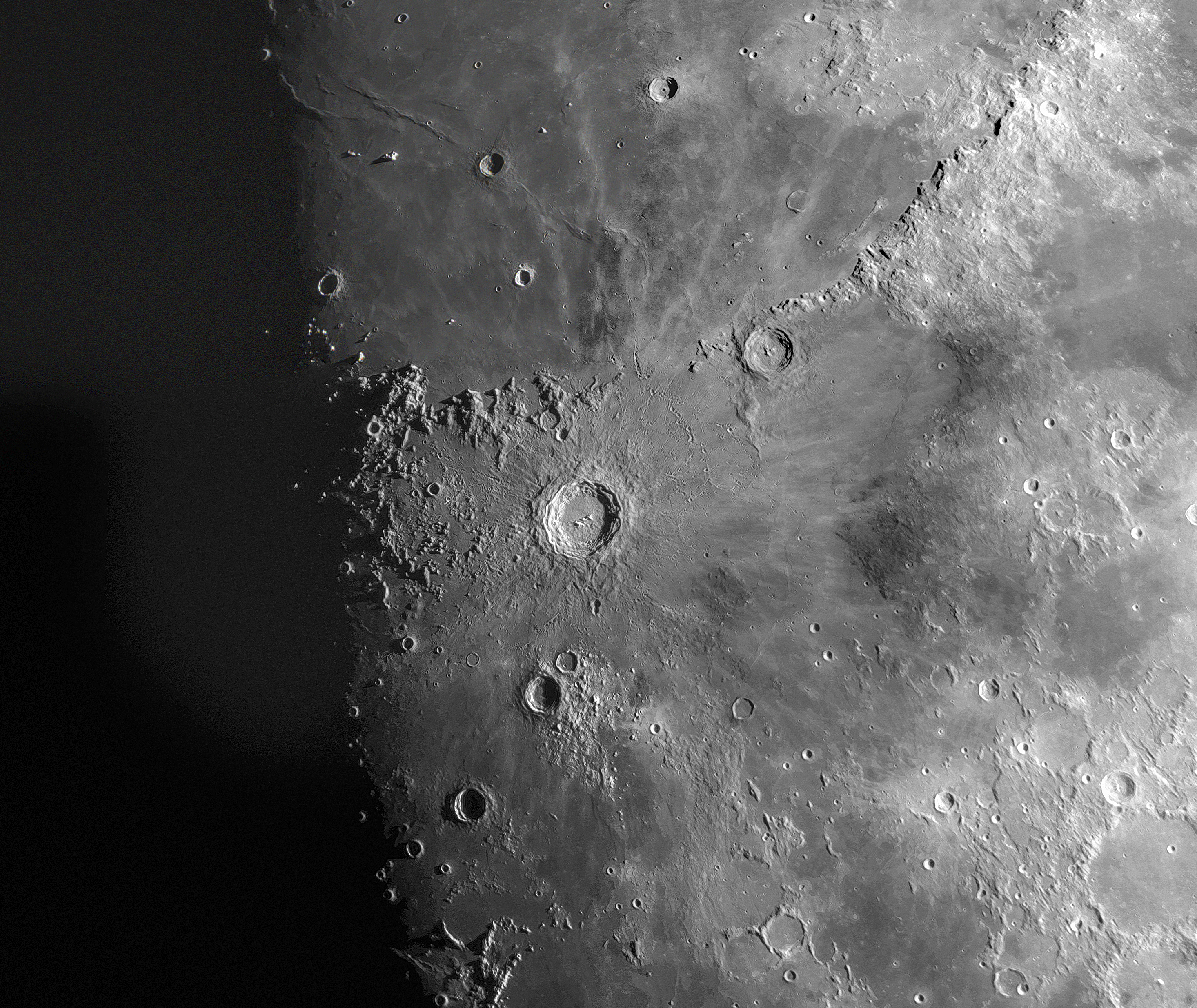 Panorama aus sieben Bildern. Alles überragend: Der junge Kopernikus mit gigantischen Ablagerungen von dunklem, pyroklastischem Material.