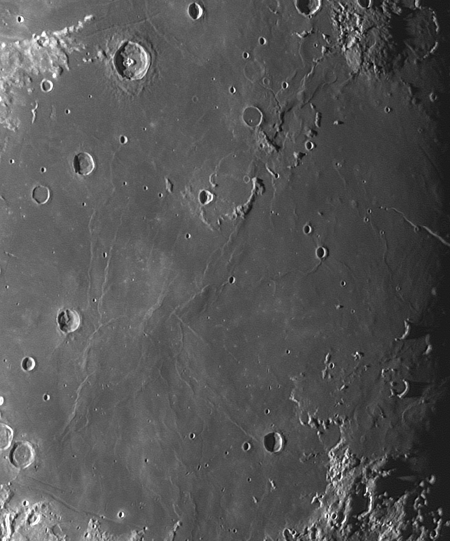 Schöner Kontrast: Links unten die Landestelle von Apollo XI mit den Kratern Armstrong, Collins und Aldrin.und rechts oben der gewaltige Gardner-Komplex: ein vulkanischer Megadom mit einer Ausdehnung von 120 x 90 Kilometern. Viele Dome in Vitruvius und Cauchy.